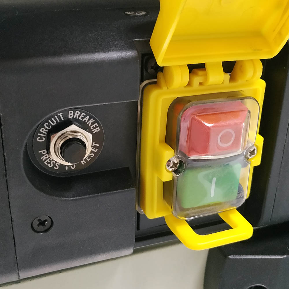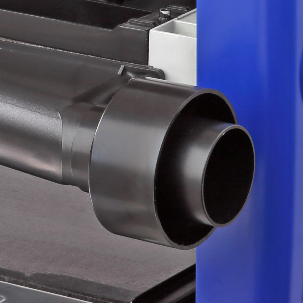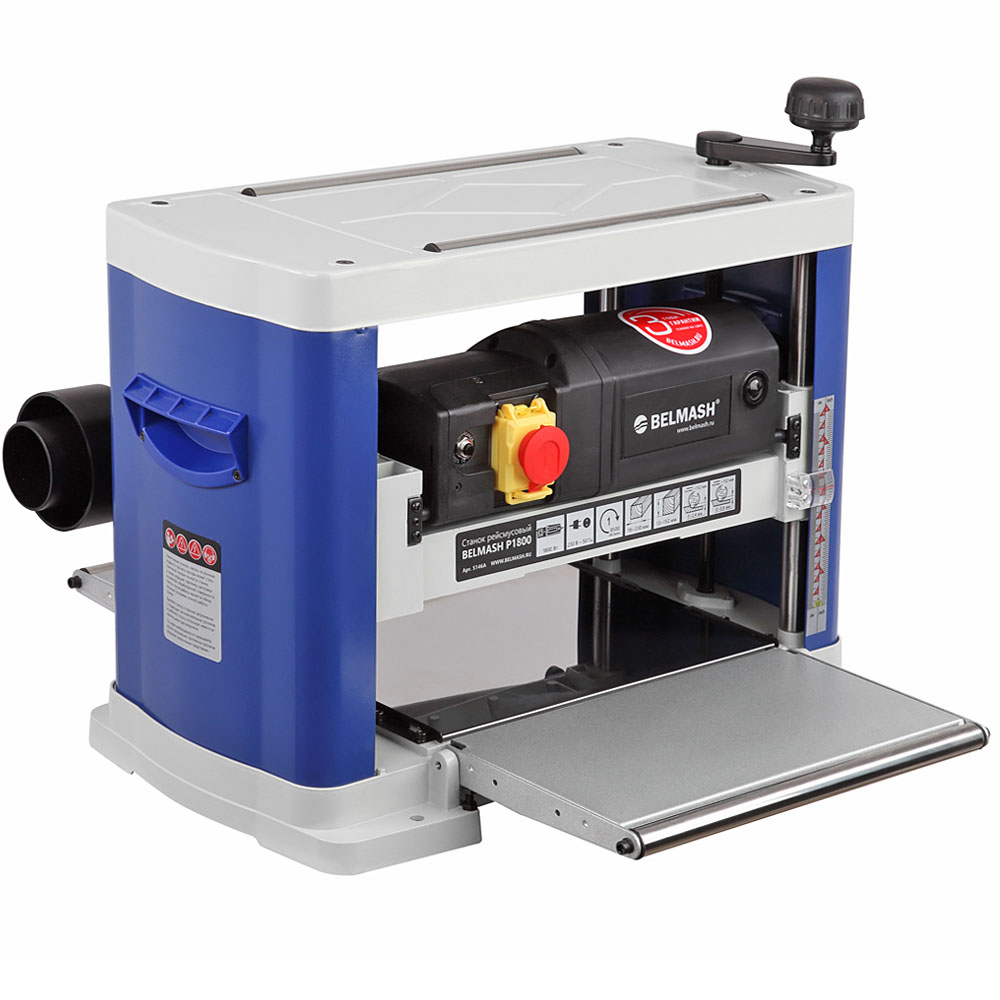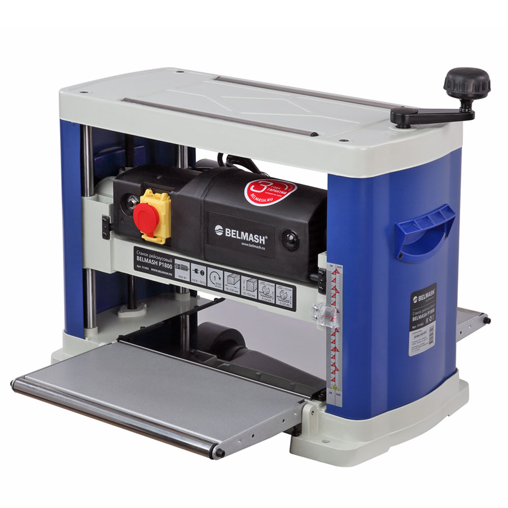 Станок рейсмусовый БЕЛМАШ P1800 имеет литое основание с отверстиями для крепления к верстаку. Рабочий стол основания покрыт полированным листом нержавеющей стали. Имеет откидные расширения со вспомогательными роликами. С боков основания расположены несущие стойки, по которым перемещается платформа с ножевым валом и двигателем. Привод устройства _ однофазный коллекторный электродвигатель с двойной изоляцией и токовой защитой. Конструктивно узел привода объединен в один блок и включает понижающий редуктор с цепной передачей для автоматической подачи заготовки. Автоподача осуществляется подпружиненными обрезиненными роликами. Глубина реза настраивается рукояткой регулировки. Результат настройки показывает указатель шкалы. На ножевом валу установлены два ножа с двухсторонней заточкой. В случае затупления одной стороны, нож можно перевернуть и продолжать работу. Сверху станок закрыт защитным кожухом, являющимся одновременно опорой для протяжных роликов и связывающим элементом для несущих стоек и боковых панелей. Ролики используются для возврата заготовки на следующий проход. На торцах станка расположены ручки для переноски. Для отвода отходов резания предусмотрен кожух, который имеет патрубок отвода стружки 52 мм. Его направление при установке может быть как в правую, так и в левую сторону. На патрубок надевается универсальный адаптер с диаметрами под подключение пылесоса на 63 и 102 мм.