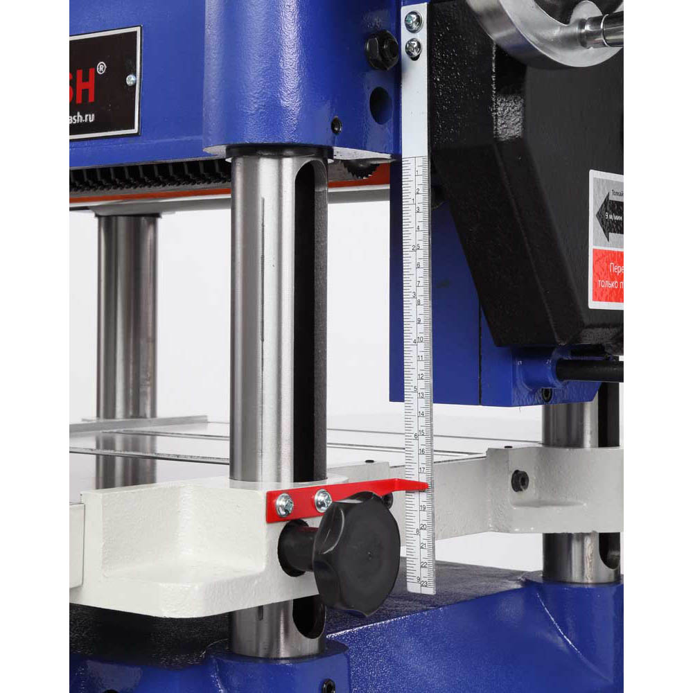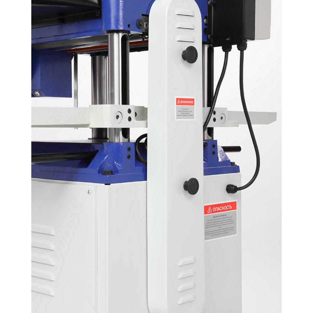 Станок предназначен для обработки древесины рейсмусованием с целью придания ей необходимых размеров. Основное преимущество – чугунные рабочий и два расширительных стола. Максимальный размер сечения обрабатываемого материала – 380x203 мм (ШxВ). Подача автоматическая, скоростей две – 5 и 9 м/мин. Процесс осуществляется двумя валами – подачи (зубчатым) и разгрузки (цельным). Два ролика рабочего стола облегчают перемещение заготовки. Регулировка высоты роликов зависит от типа обрабатываемого дерева. Диапазон настройки находится в пределах от 0 до 1,5 мм. В верхней части установлены два прокатных ролика для возврата заготовки. На данную модель установлен вал helical (сегментированный) с 75 ножевыми пластинами. Такая конструкция дает лучшее качество обработки, особенно при работе с твердыми породами дерева или при высокой загрузке оборудования. Имеется патрубок для отвода стружки, диаметр 100 мм. К нижней части корпуса крепится устройство для перемещения станка. Данная опция очень удобна и актуальна, т. к. несмотря на массу изделия в 270 кг перемещать станок по мастерской сможет один человек и без серьезных усилий.