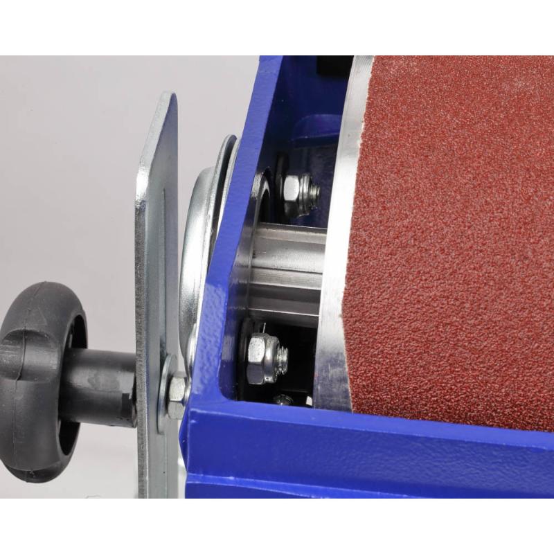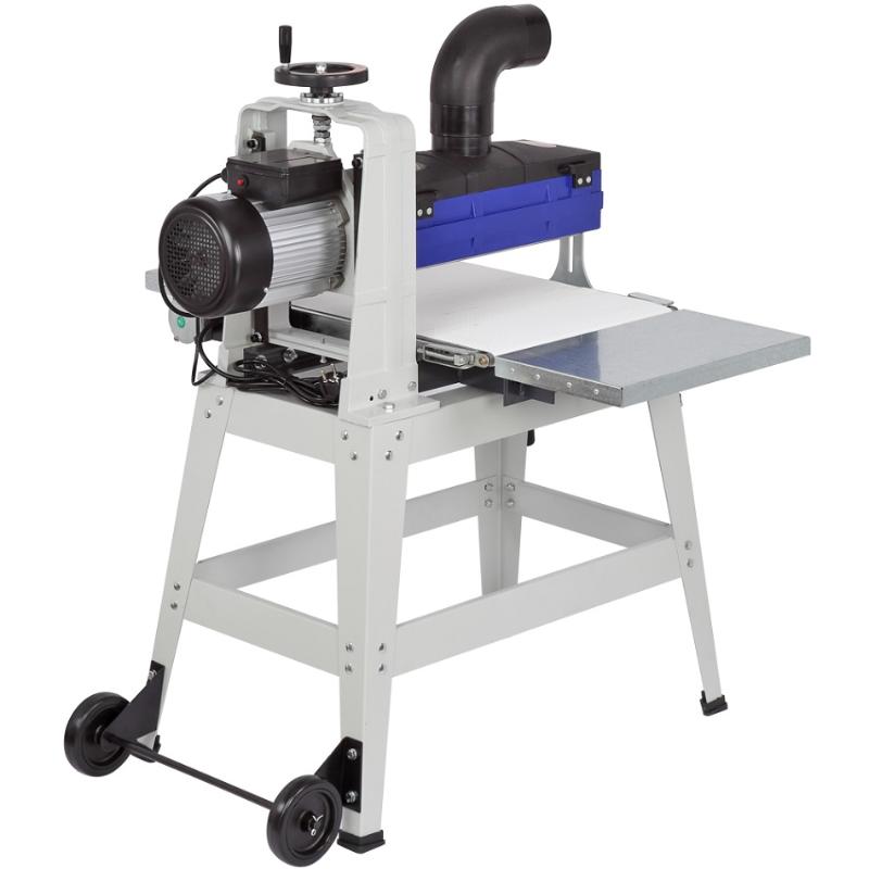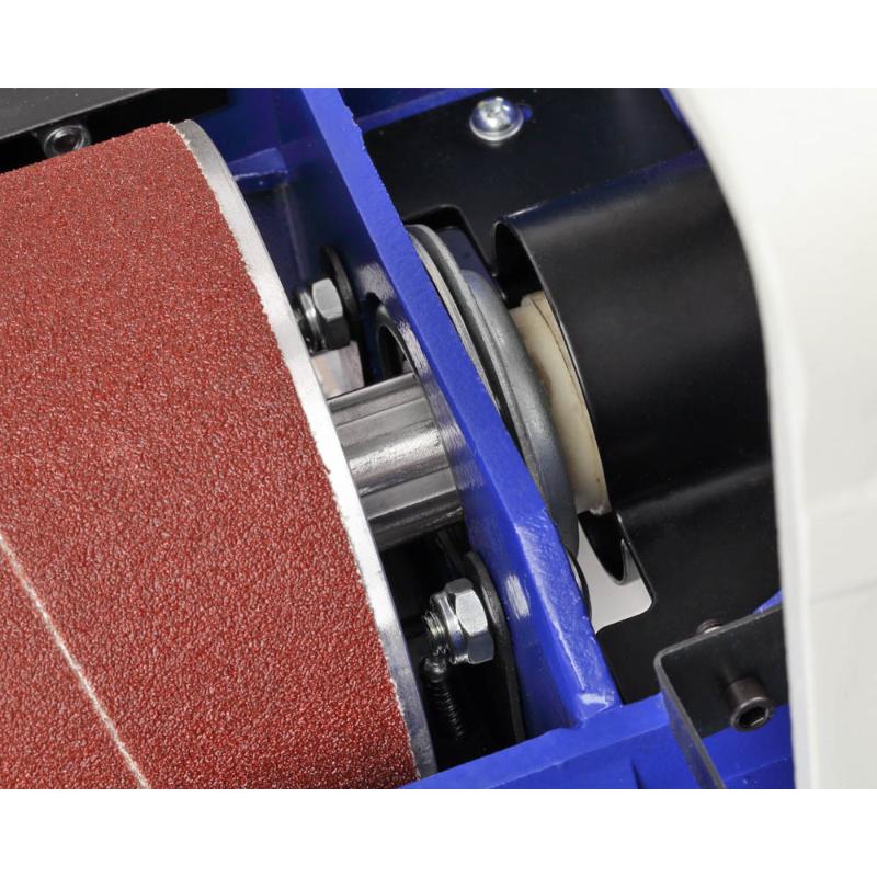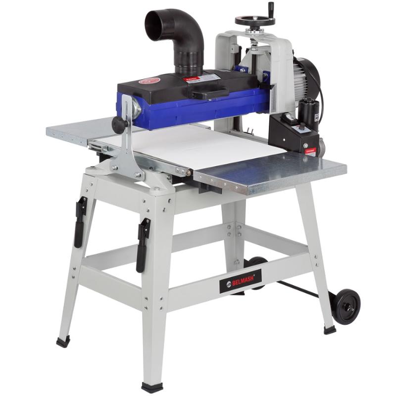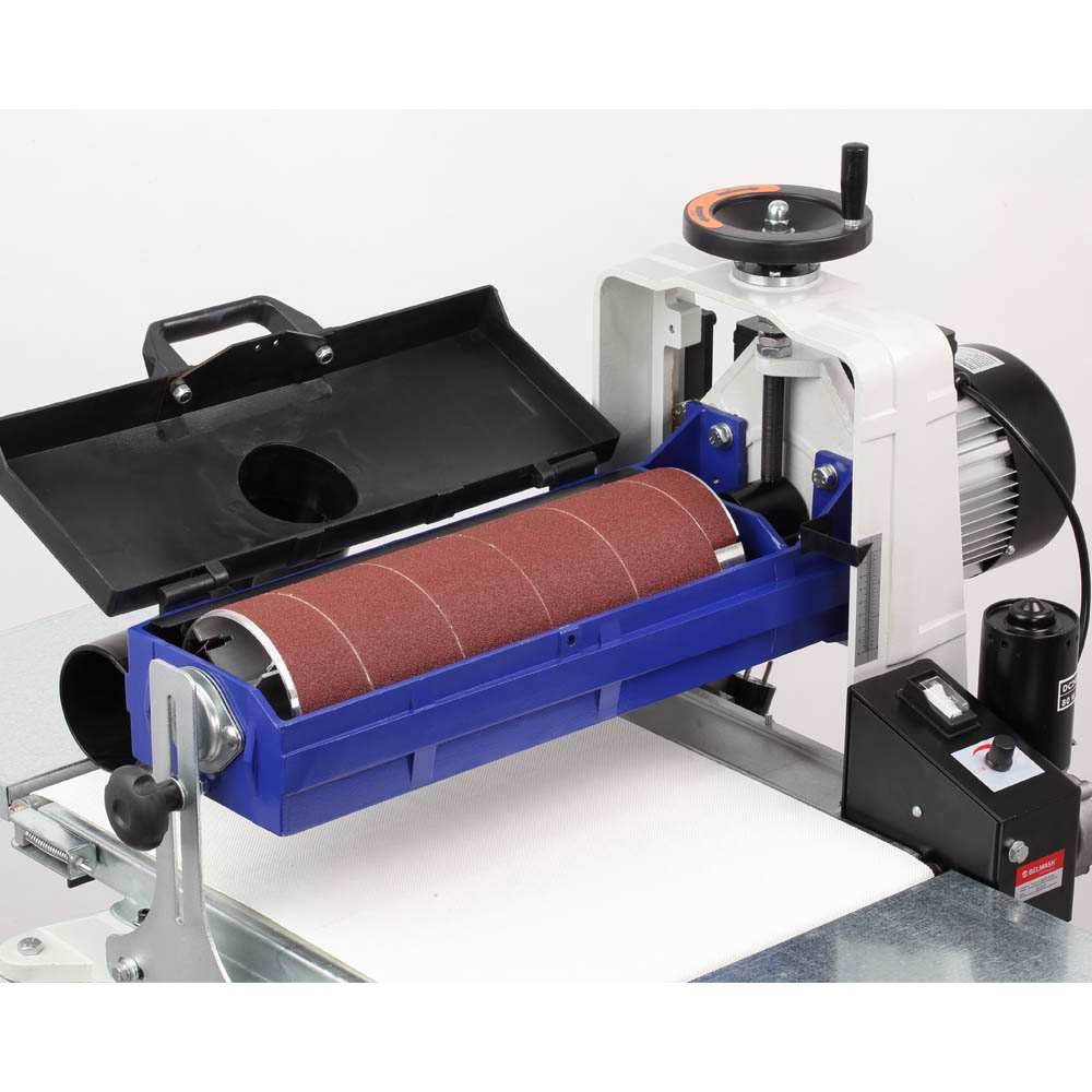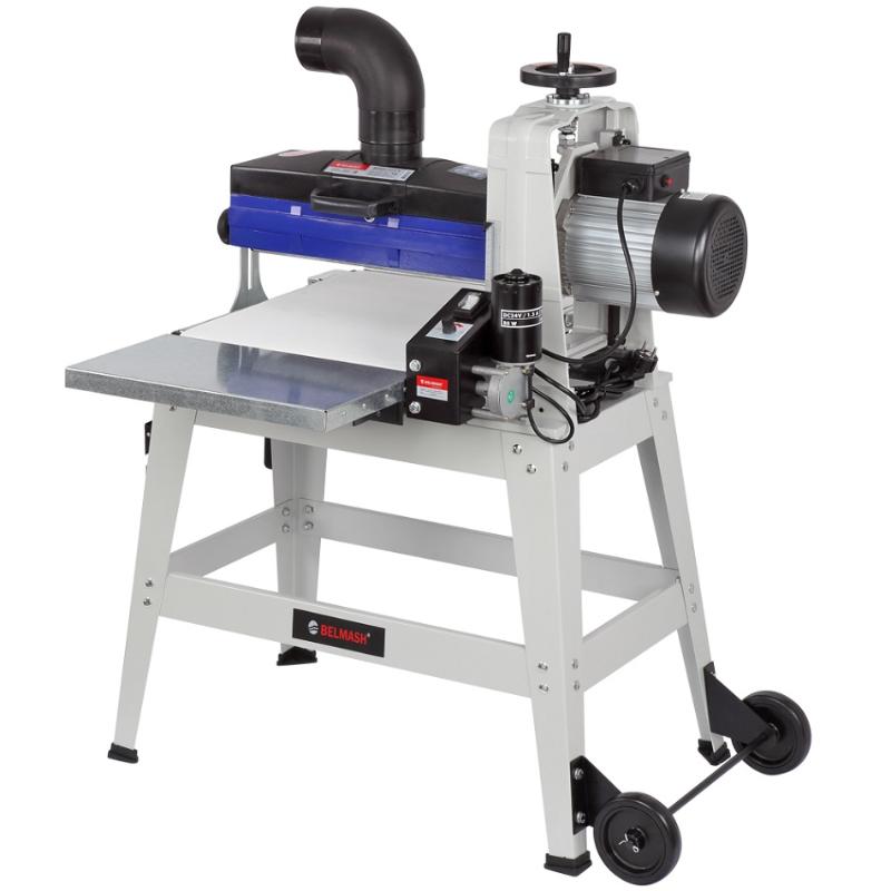 Шлифовальный барабанный станок BELMASH DS410-W предназначен для обработки деревянных заготовок путем шлифования абразивным материалом. Основной рабочий орган – шлифовальный барабан длиной 415 мм и диаметром 132 мм, на который намотана шлифовальная лента. Частота вращения шлифовального барабана составляет 1440 оборотов в минуту, что достигается благодаря асинхронному электродвигателю мощностью 1500 Вт. В станке реализована функция автоподачи. Заготовка протягивается транспортной лентой из специального нескользящего материала. В движение ленту приводит дополнительный коллекторный электродвигатель мощностью 80 Вт. Скорость подачи регулируется от 0 до 3,5 м/мин. Панель управления простая, на ней расположен клавишный выключатель и ручка регулировки скорости движения транспортной ленты. На кожухе шлифовального блока имеется патрубок для подключения системы пылеудаления (диаметр 100 мм). Станина выполнена из чугуна. Подставка – сборная стальная. Она снабжена складными ручками и парой колёс для удобного перемещения станка по мастерской. Кнопка выключателя в пылезащищенном исполнении.