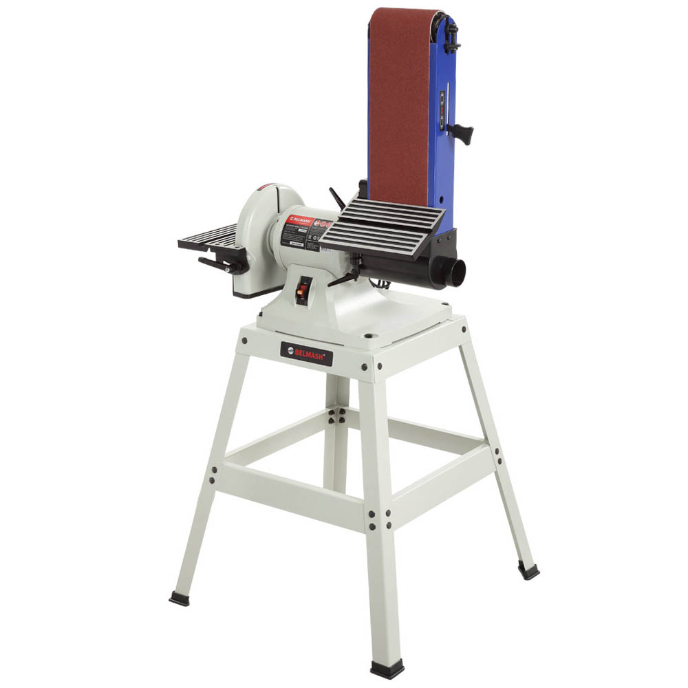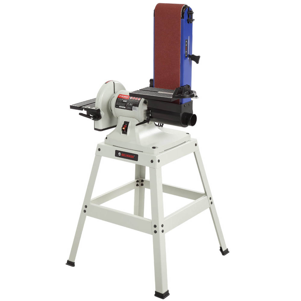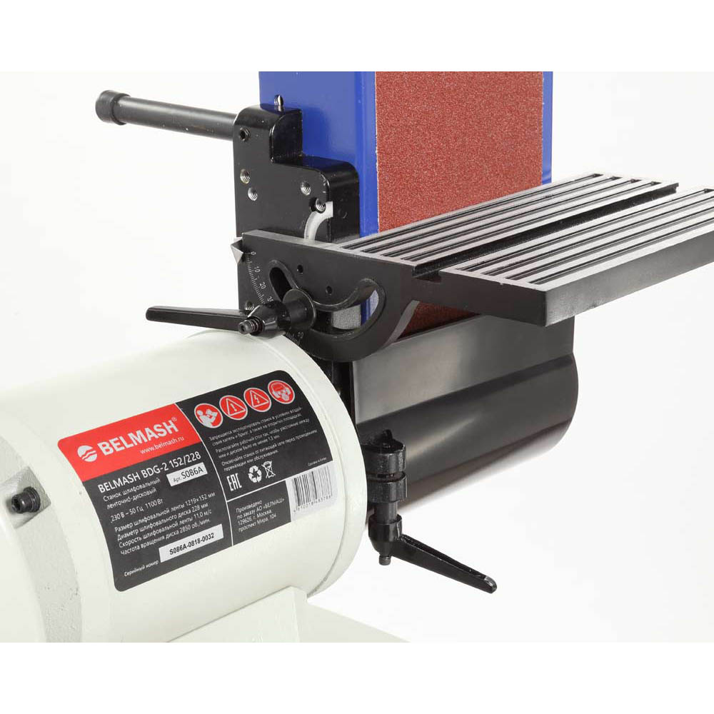 Самая мощная модель в линейке шлифовальных станков BELMASH. Корпус станка литой, алюминиевый. Рабочих столов два – отдельно для шлифования лентой и диском, это удобно, т. к. при переходе между операциями стол переустанавливать не требуется. Выполнены они из алюминия, имеют паз под установку углового упора. Угол наклона стола при ленточном шлифовании – от 0 до 60 град., при дисковом – от 0 до 45 град. Ленточный шлифовальный блок поворотный. Абразивные материалы стандартные: лента – 1219x152 мм, диск – диаметр 228 мм. В комплекте поставки предусмотрено сборное стальное основание, на которое станок крепится с помощью 4-х болтов. При желании станок можно установить на верстак. Двигатель асинхронный.