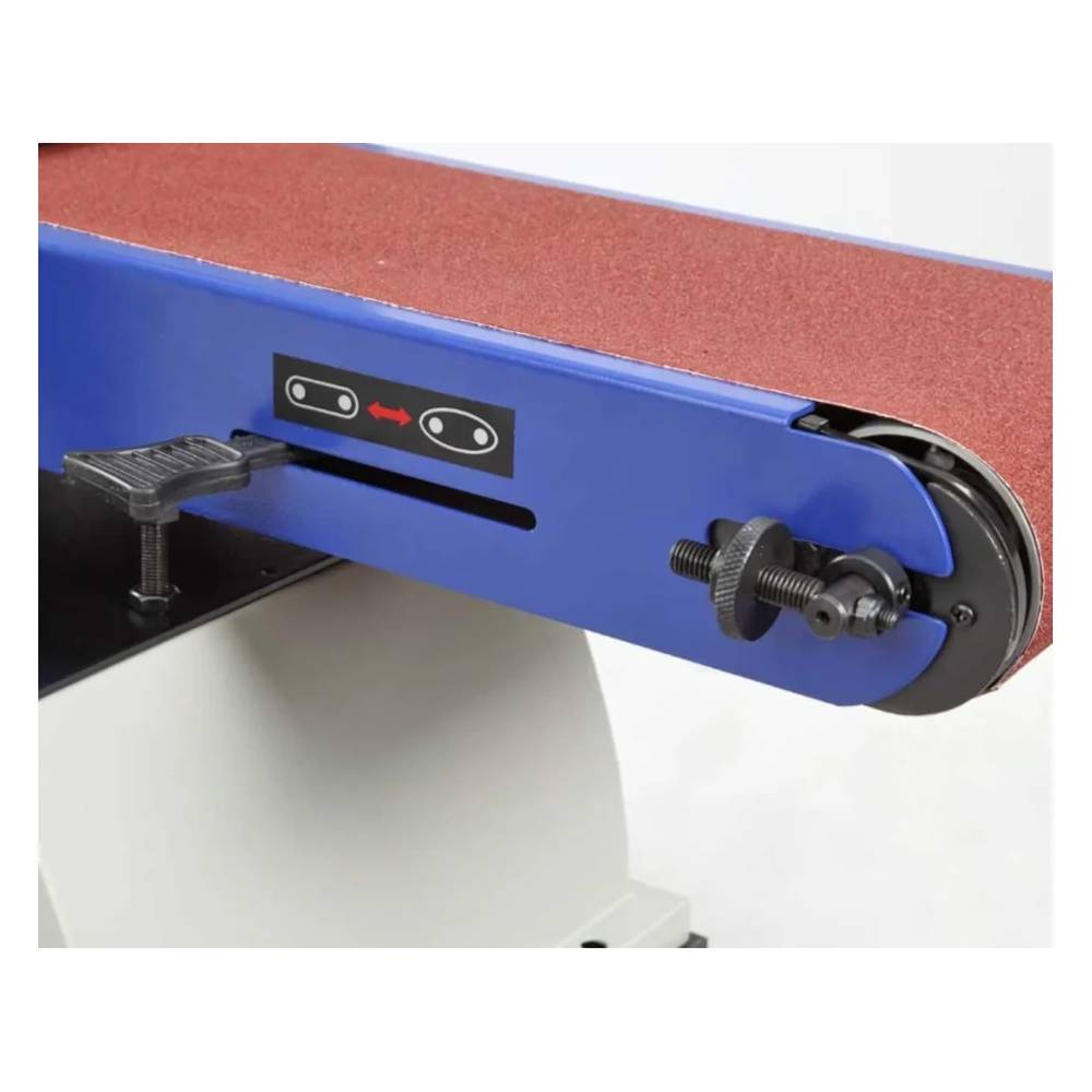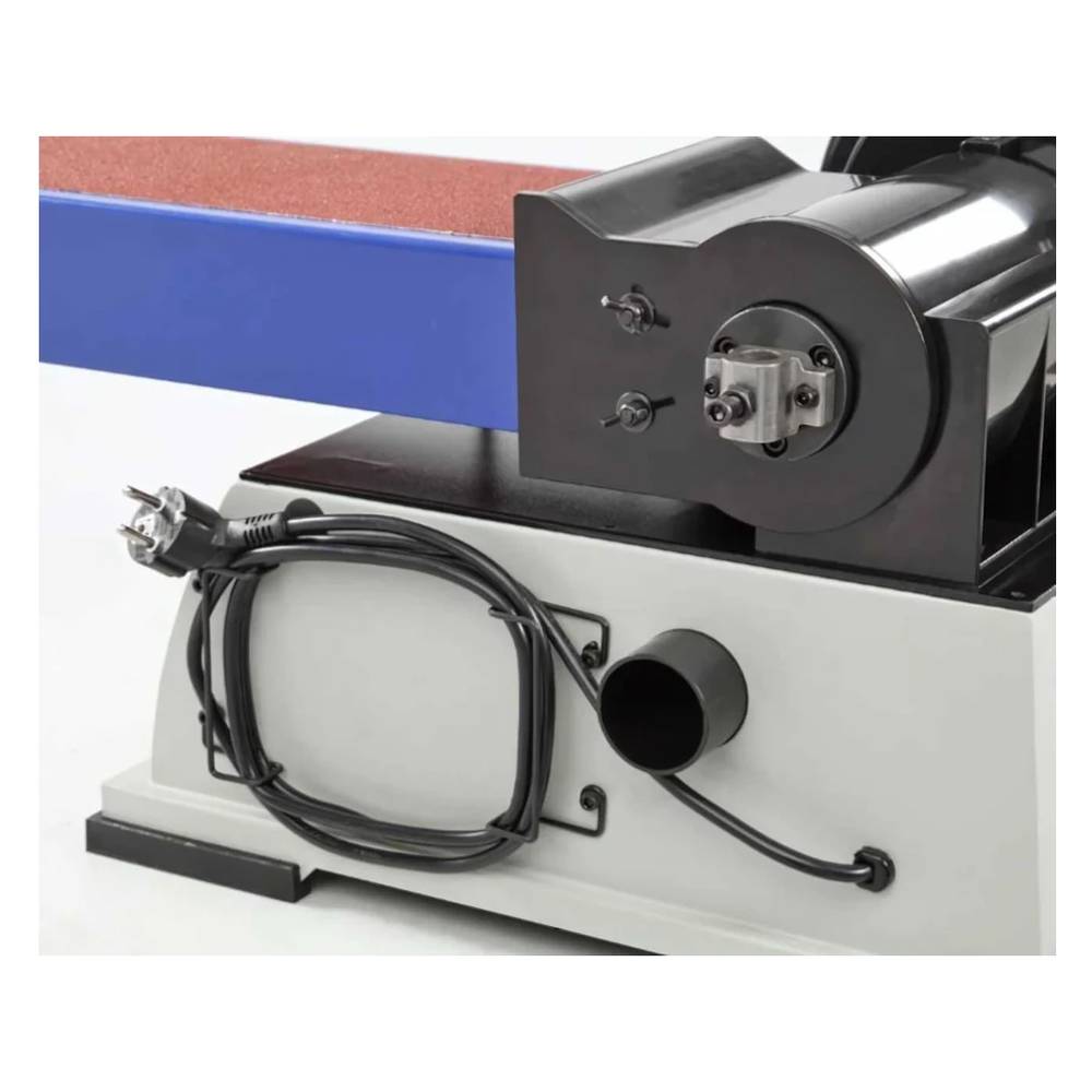 Станок оснащен асинхронным двигателем 800 Вт. Мотор обладает высокой производительностью и работает без потери мощности под нагрузкой. Частота вращения шпинделя — 2600 об/мин, скорость движения ленты — 10,2 м/с. Для работы используется лента 1219x152 мм и шлифовальный диск диаметром 228 мм. Наклонный ленточный узел позволяет обрабатывать заготовки под любым углом.