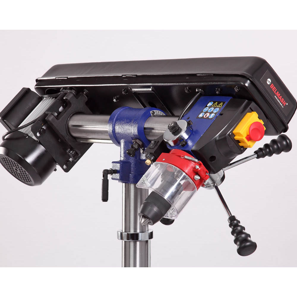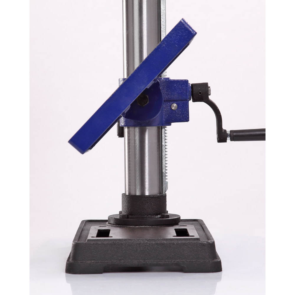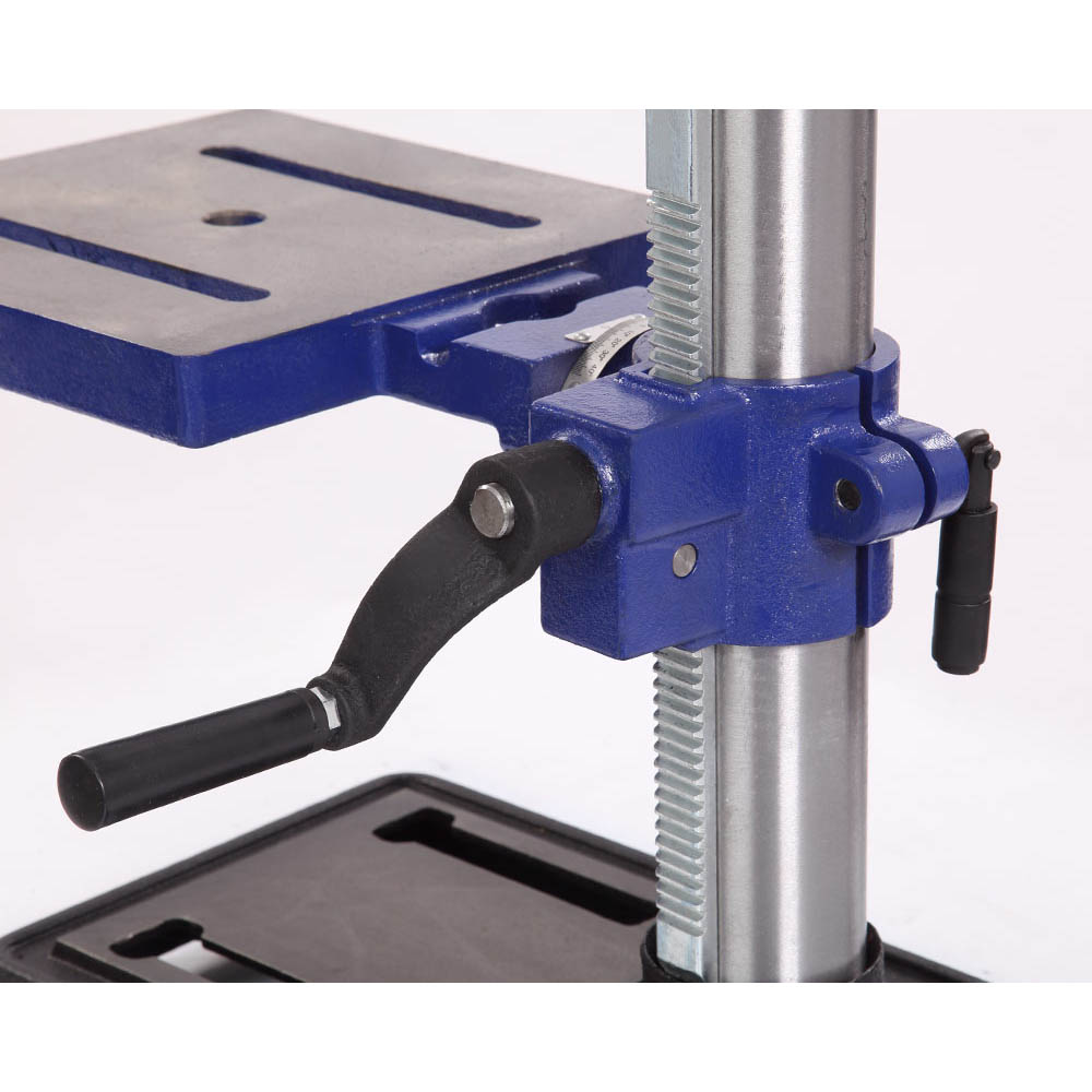 Патрон быстрозажимной с максимальным диаметром зажимаемого хвостовика инструмента 16 мм. Диаметр стойки (колонны) 60 мм, имеется зубчатая рейка, поднятие/опускание стола настраивается с помощью рукоятки. Управление станком осуществляется тремя кнопками – выключатель лазера - указателя, «пуск» и «остановка», выключатель снабжен крышкой. В опоре имеется два отверстия для крепления к верстаку, что дает дополнительную устойчивость и безопасность.