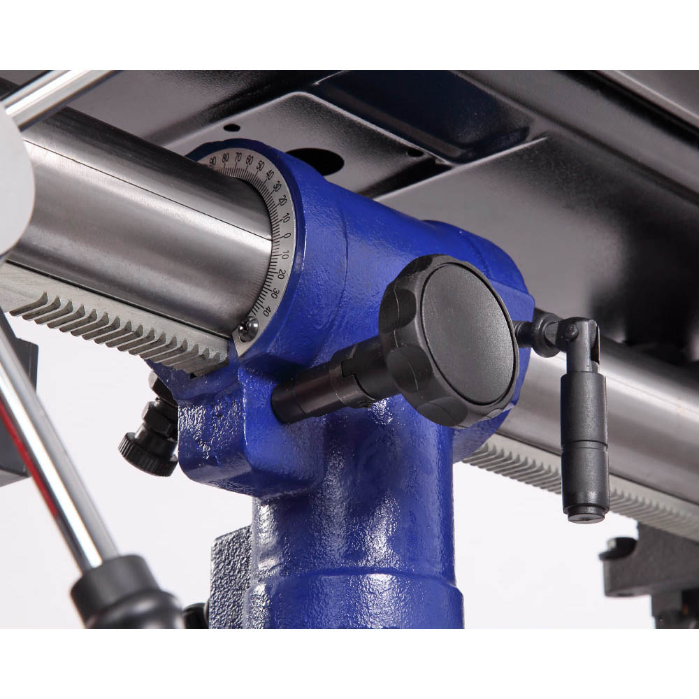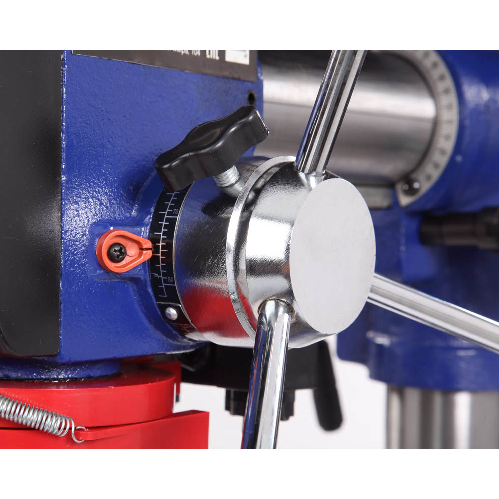 Заготовку можно крепить как к рабочему столу, так и к основанию, все зависит от ее размера. В комплекте предусмотрены тиски. Для их крепления есть по два паза на рабочем столе и на основании. Шкала, расположенная на рукоятке регулировки глубины сверления, показывает ход пиноли шпинделя, с ее помощью можно настраивать ход пиноли, для этого необходимо провернуть шкалу, стрелка на корпусе будет показывать значение, на которое будет возможно погружение сверла, затем затянуть барашек. Наконечники тройной рукояти удобной формы, что способствует плавной подаче сверла к заготовке. На станке предусмотрен лазерный указатель, который позволяет точно определить точку входа режущего инструмента в заготовку.