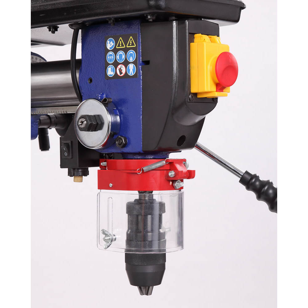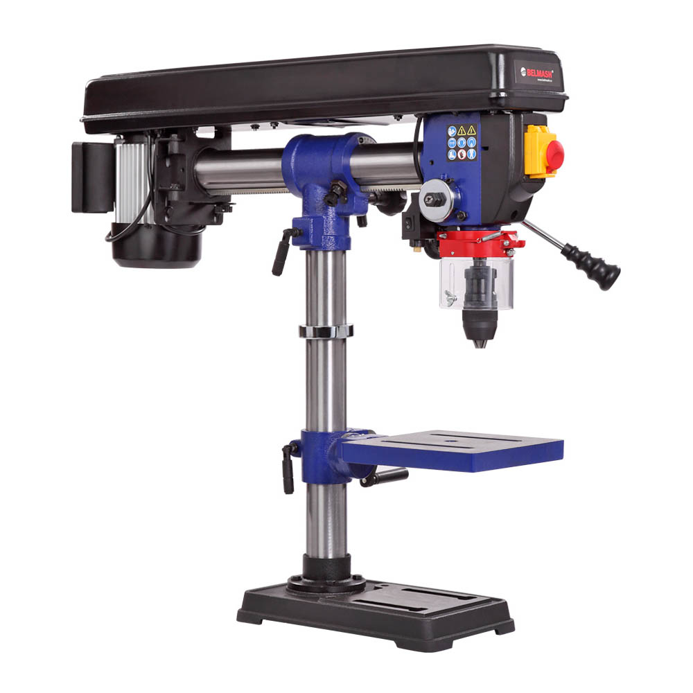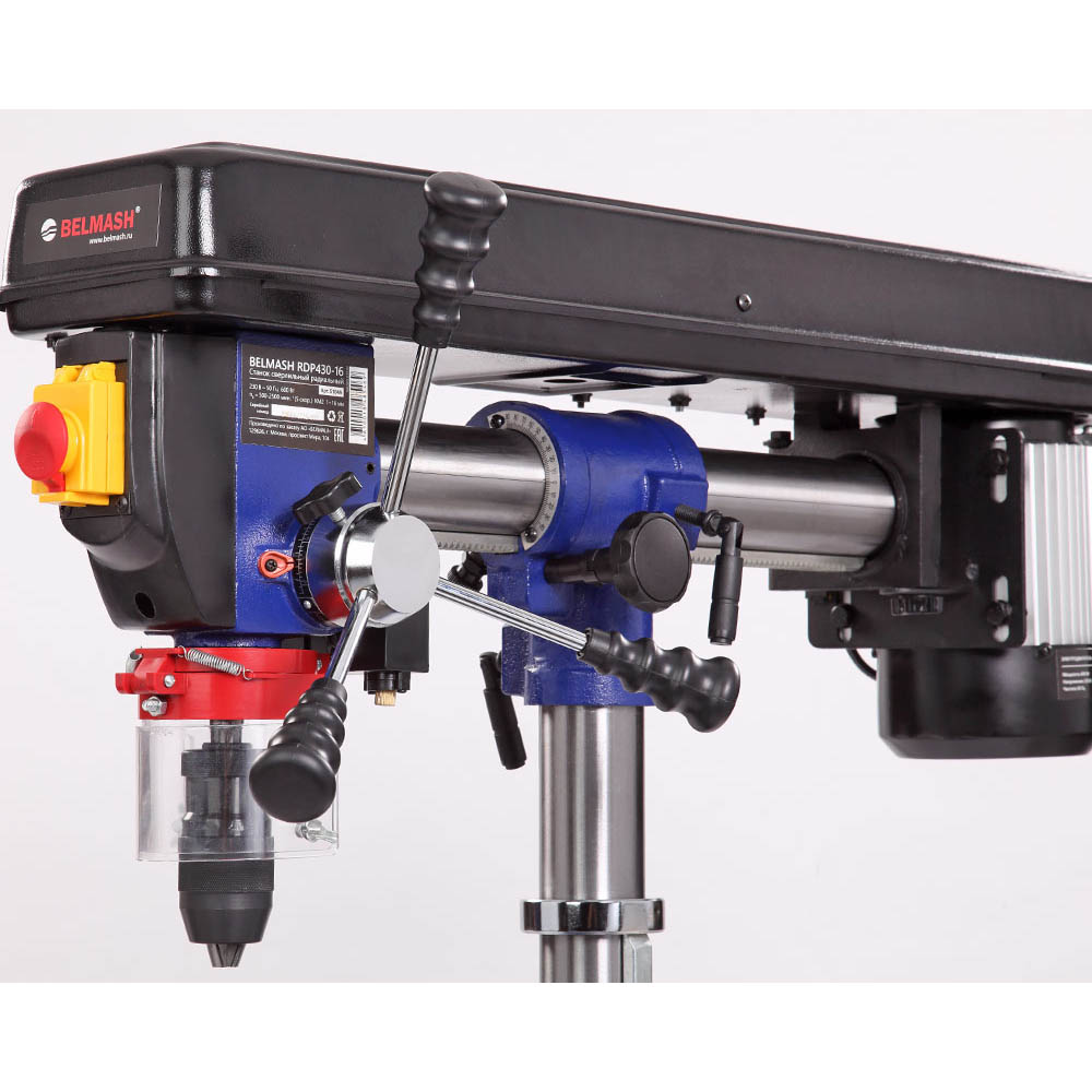 Станок предназначен для обработки различных материалов вращающимся режущим или шлифующим инструментом, с целью получения сквозных или глухих отверстий, растачивания, зенкерования. Модель RDP430-16 является радиальной, то есть, возможна регулировка положения сверлильной головы по высоте, относительно колонны, по горизонту и по окружности (вращается вокруг своей оси). Стол, опора и корпус сверлильной головки выполнены из чугуна, что придает станку серьезный вес 37,5 килограмм. Двигатель асинхронный, мощностью 600 Вт. Станок высокий – 810 мм, подходит для обработки заготовок большой толщины. Максимальное расстояние между шпинделем и столом – 355 мм.