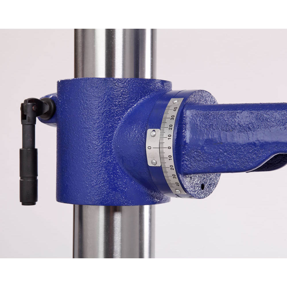 Заготовку можно крепить как к рабочему столу, так и к основанию, все зависит от ее размера. В комплекте предусмотрены тиски. Для их крепления есть шесть пазов на рабочем столе и два на основании. Шкала, расположенная на рукоятке регулировки глубины сверления, показывает ход пиноли шпинделя, с ее помощью можно настраивать ход пиноли, для этого необходимо провернуть шкалу, стрелка на корпусе будет показывать значение, на которое будет возможно погружение сверла, затем затянуть барашек. Наконечники тройной рукояти удобной формы, что способствует плавной подаче сверла к заготовке. максимальный ход пиноли шпинделя 80 мм. На станке предусмотрен лазерный указатель, который позволяет точно определить точку входа режущего инструмента в заготовку.