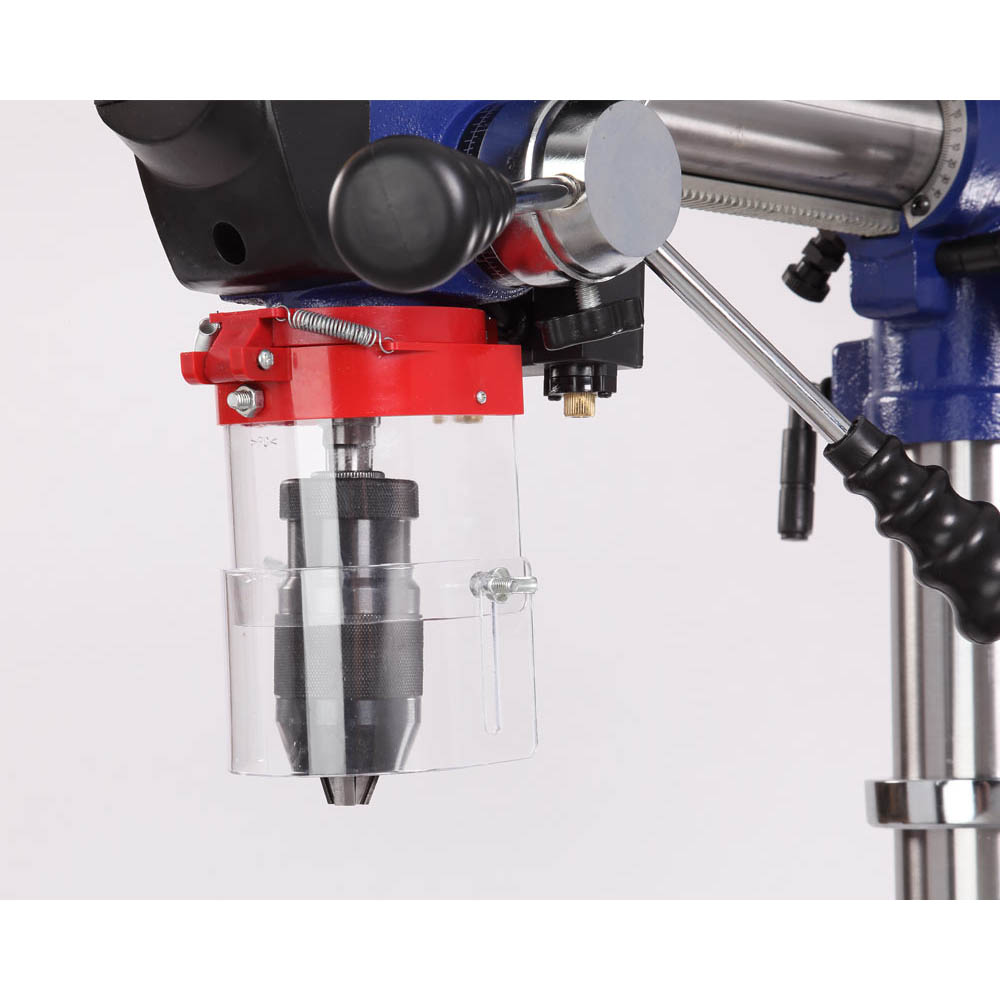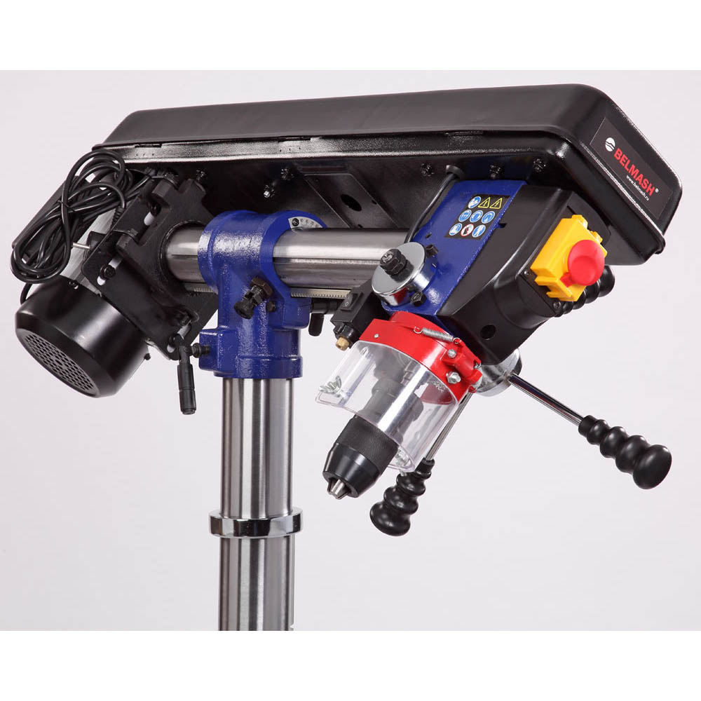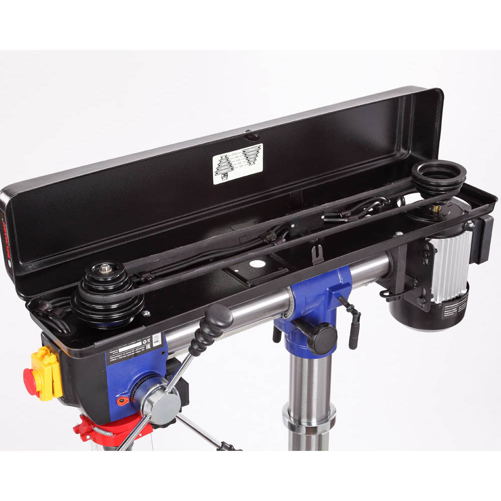 Самый высокий станок в линейке сверлильного оборудования BELMASH – 1630 мм, подходит для обработки заготовок большой толщины. Максимальное расстояние между шпинделем и столом – 740 мм. Имеется пять ступеней скорости вращения шпинделя, что необходимо при выполнении различных операций и типах материала. Переключение производится за счет переброски ремня. Для этого необходимо открыть крышку ременного отсека, ослабить барашек крепления двигателя, тем самым получив возможность смещения шкива, перекинуть ремень и проделать операцию в обратной последовательности.