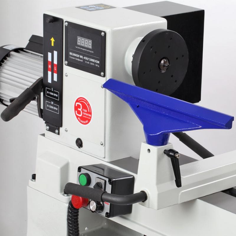 Станок BELMASH WL-450/1200EVSM применяется для обработки древесины c целью придания ей необходимых форм и размеров методом точения. На станке выполняют черновое и чистовое точение цилиндрических, конических, фасонных поверхностей и т. п. Станок имеет мощный асинхронный двигатель – 1500 Вт. Диапазонов скоростей два: низкий - от 0 до 1200 об./мин., и высокий – от 0 до 3200 об./мин. Скорость регулируется плавно с помощью частотного преобразователя. Отличительная особенность – выносной пульт управления с магнитной фиксацией. Станина, подручник и опоры изделия выполнены из высококачественного чугуна. Направляющие шлифуются с высокой точностью для обеспечения плавного хода подручника, передней и задней бабки. В линейке токарных станков данная модель выделяется наибольшим расстоянием между центрами – 1200 мм. Диаметром обработки над станиной тоже не маленький – 460 мм. Станок имеет функцию секторного перемещения.