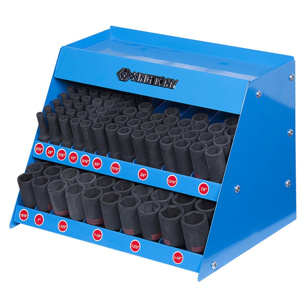 Стенд с ударными глубокими торцевыми головками представляет собой набор оснастки для автогаражных работ. Найти головку нужного размера не составляет труда благодаря нумерации ячеек.