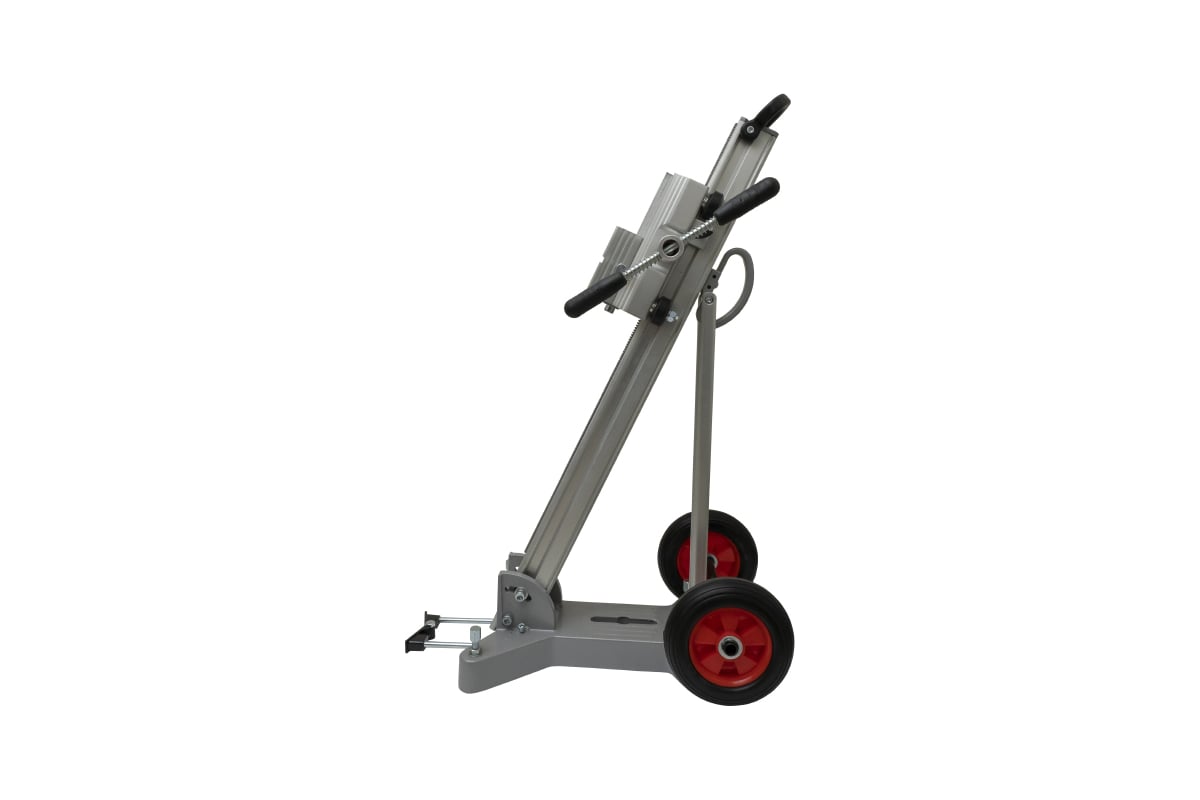 Надежная стойка для алмазного бурения с роликовыми направляющими каретки, прочным основанием для анкерного крепления, транспортировочными колесами, лазерным индикатором центра отверстия и быстросъемным креплением электробормотора для сверления отверстий D до 400 мм.