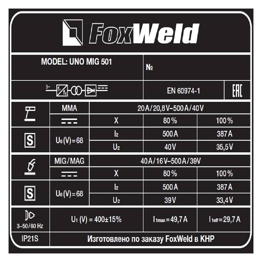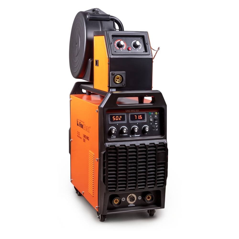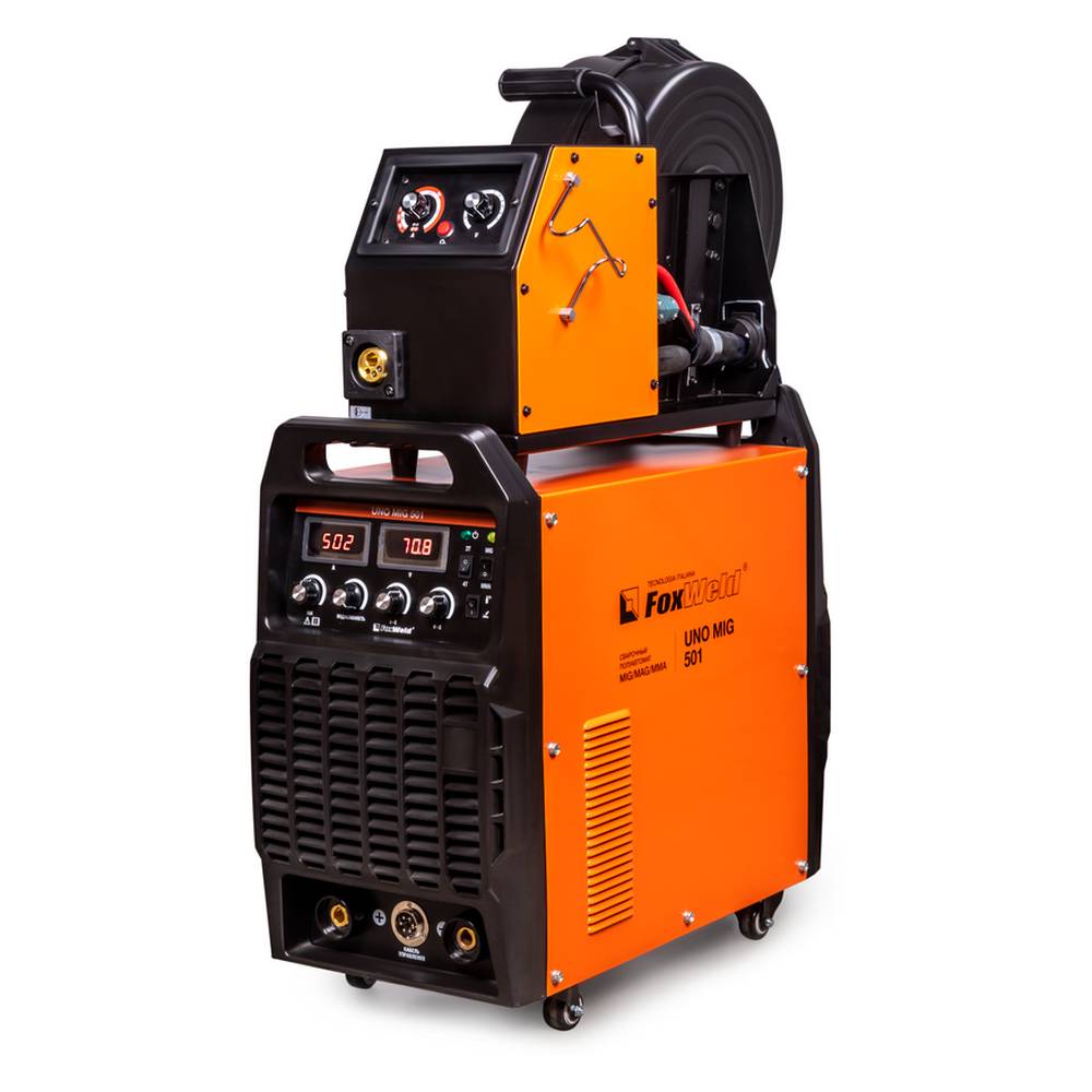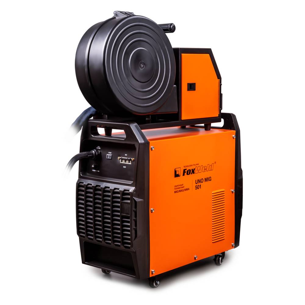 Сварочный полуавтомат инверторного типа UNO MIG 501 предназначен для широкого использования в отраслях по производству различных стальных конструкций. С помощью FOXWELD UNO MIG 501 можно проводить сварку в полуавтоматическом режиме MIG/MAG и ручном режиме MMA, используя инверторную технологию преобразования и управления процессом сварки. Сварочный аппарат UNO MIG 501 позволяет сваривать изделия из углеродистой и нержавеющей стали. Источник питания и механизм подачи выполнены в раздельном исполнении и соединены при помощи кабеля управления для проведения сварочных работ на удалении. Полуавтомат отличается небольшим весом, компактной конструкцией и высокой производительностью.