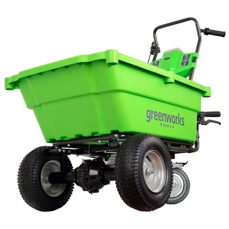 Тачка самоходная Greenworks G40GCk4 40В предназначена для перевозки груза массой до 100кг. Объем ковша садовой тележки составляет 106 литров. Ковш оборудован специальными местами для надставных бортов или для крепления грузов ремнями. Максимальная скорость вперед 4.2км/ч, скорость обратного хода 2.4км/ч. Для удобной выгрузки материала предусмотрен подъемный механизм ковша с газовым упором (самосвал). Опорное колесо имеет стояночный тормоз. Время автономной работы до 45 минут от 4Ач батареи, а максимальная дистанция хода до 3км.