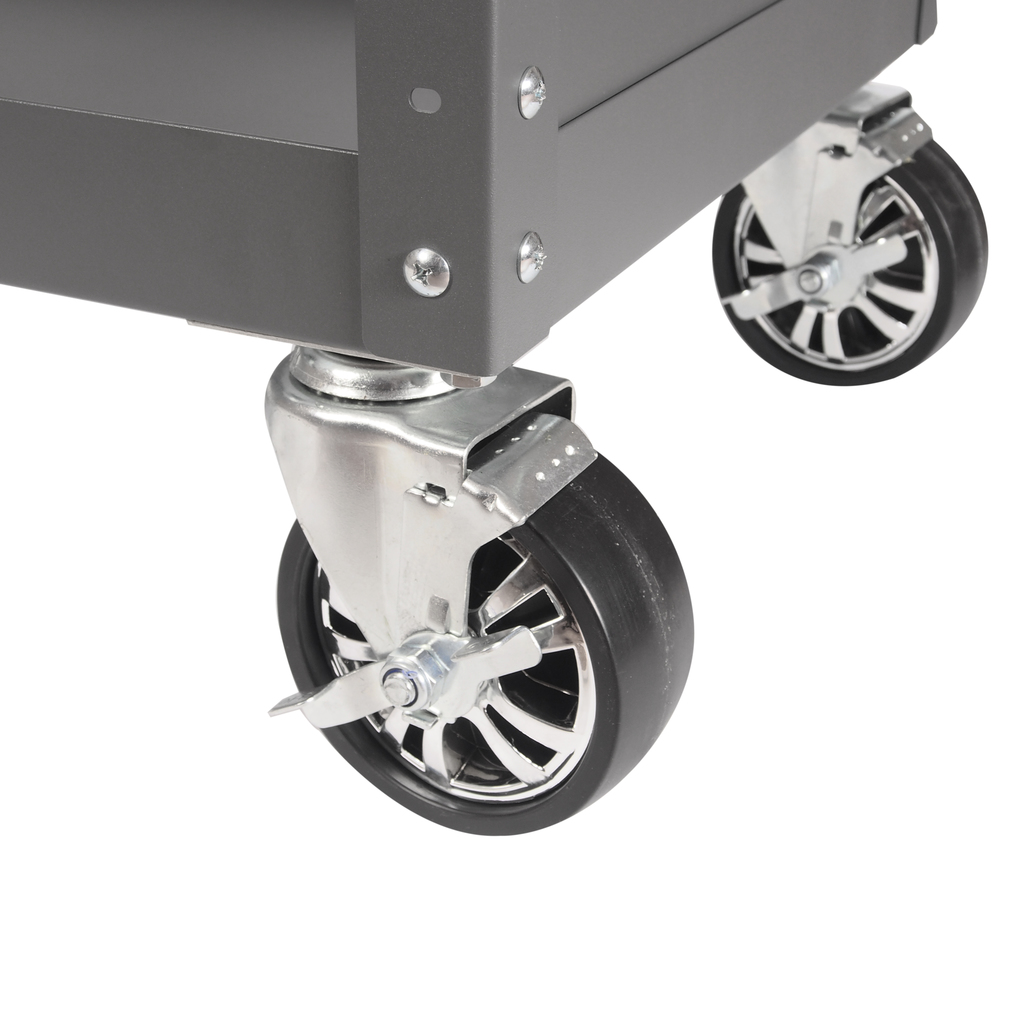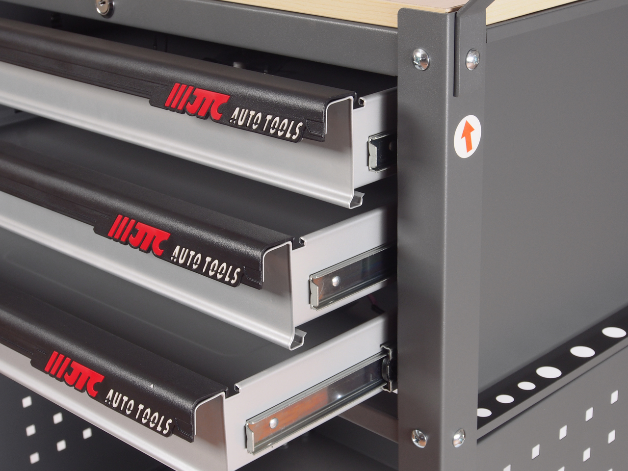 Перфорированные внутренние стенки боковых ящиков с квадратными отверстиями предоставляют возможность разместить дополнительные аксессуары для хранения инструментов. Применяется с серией подвесных приспособлений JTC-3218.