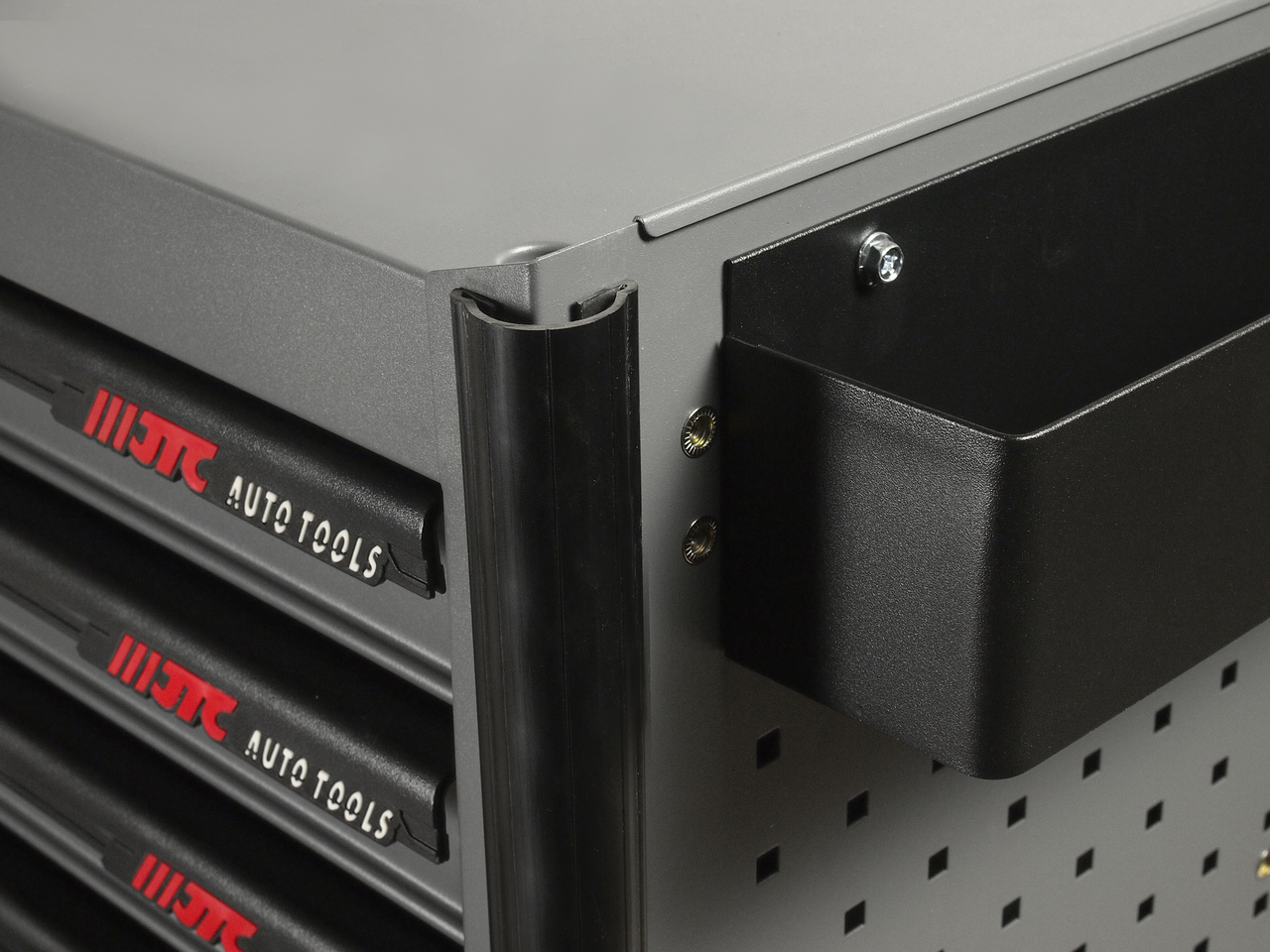 Перфорированные боковые стенки с квадратными отверстиями предоставляют возможность разместить дополнительные аксессуары для хранения инструментов. Применяется с серией подвесных приспособлений JTC-3218.