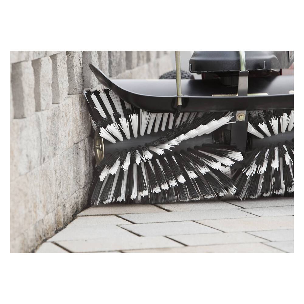 - Универсальная щетка - справляется практически с любым видом загрязнений. Жесткие белые щетины предназначены для въевшейся грязи, мха, снега. Мягкие черные – для уборки пыли и листвы. Щетка изготовлена из морозостойкого полипропилена, обеспечивающего ресурс не менее 1200 моточасов