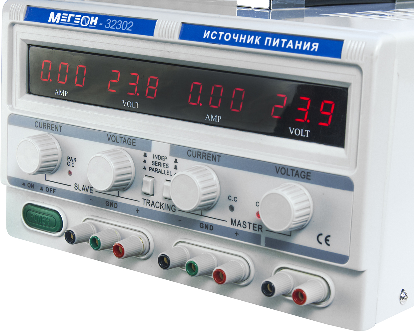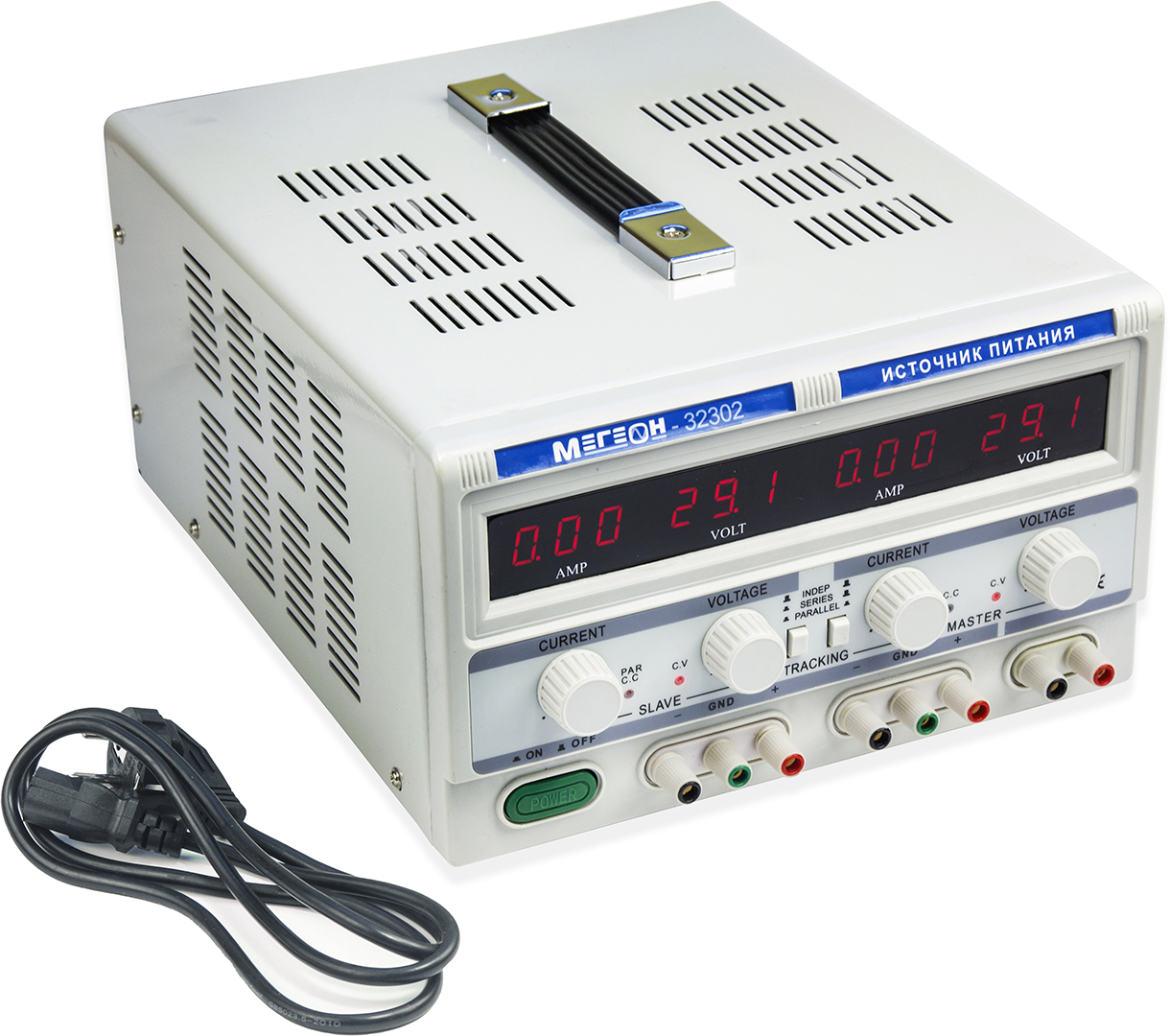 МЕГЕОН 32302 - это компактный, высокоточный, трёхканальный источник питания. Содержит два независимых регулируемых источника питания 0…30 В с током нагрузки 0…2 А и фиксированный источник 5 В и током нагрузки до 3 А, предусмотрена возможность разных схем включения двух источников. Для удобства работы предусмотрено три режима работы, включающий в себя независимый, последовательный и параллельный. Во всех каналах источника реализовано: термокомпенсация, компенсация по току, подавление пульсаций и высокоэффективная защита от перегрузки и короткого замыкания. Прибор найдёт широкое применение в учебных и исследовательских целях, при разработке и ремонте радиотехнических устройств, кроме этого подходит для промышленного применения. Станет незаменимым помощником в ремонтных мастерских, а также займёт достойное место в технических лабораториях.