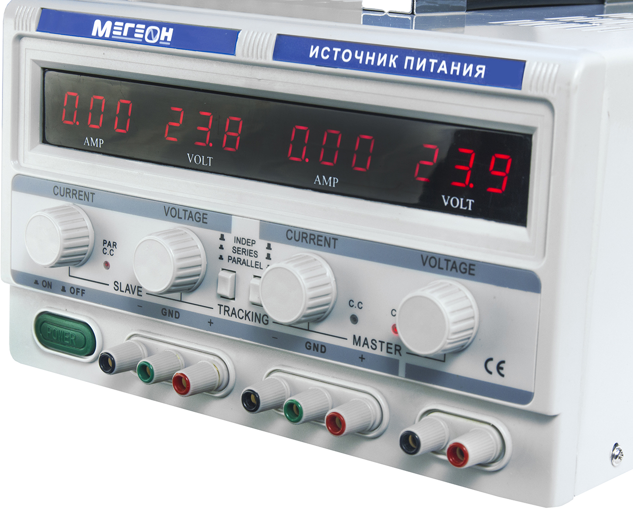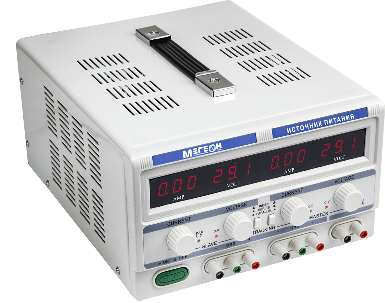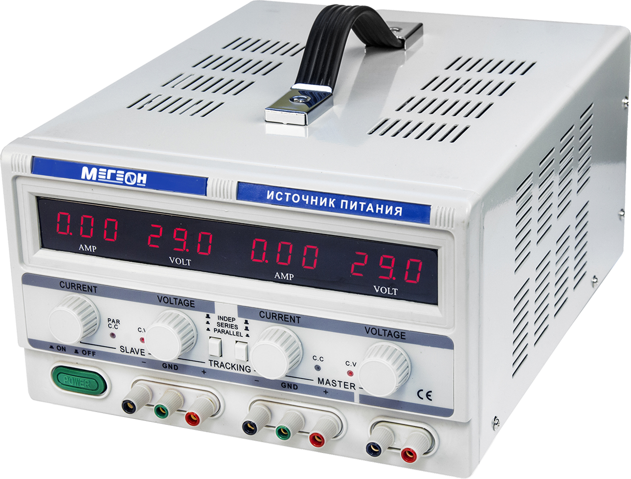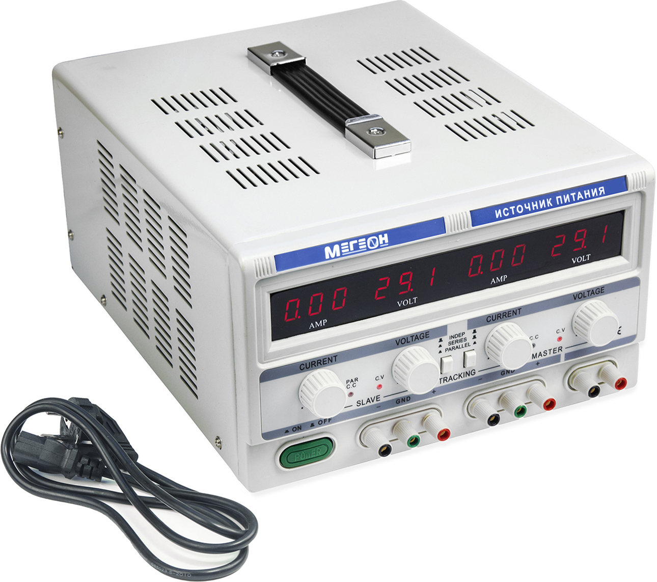 МЕГЕОН 323051 это компактный, высокоточный, трёхканальный источник питания. Содержит два независимых регулируемых канала питания 0…30 В с током нагрузки 0…5 А и фиксированный источник 5 В и током нагрузки до 3 А. Предусмотрена возможность разных схем включения двух источников. Во всех каналах источника реализовано: термокомпенсация, компенсация по току, подавление пульсаций и высокоэффективная защита от перегрузки и короткого замыкания. Отключение и включение нагрузки в одно нажатие. Благодаря стальному копрпусу обеспечивается сохранность и долговечность компонентов, а благодаря яркому ЖК-дисплею и большому шрифту - максимальное удобство при эксплуатации. Прибор найдёт широкое применение в учебных и исследовательских целях, при разработке и ремонте радиотехнических устройств, кроме этого подходит для промышленного применения.