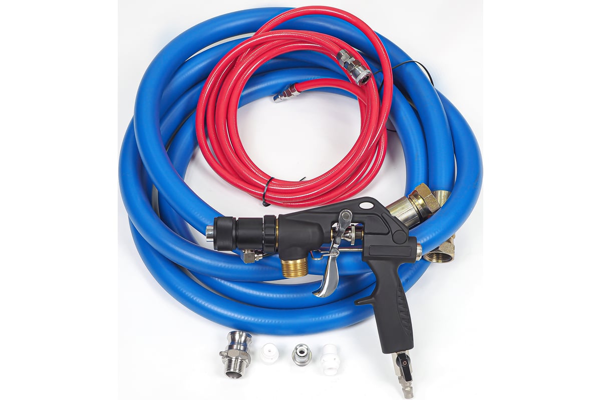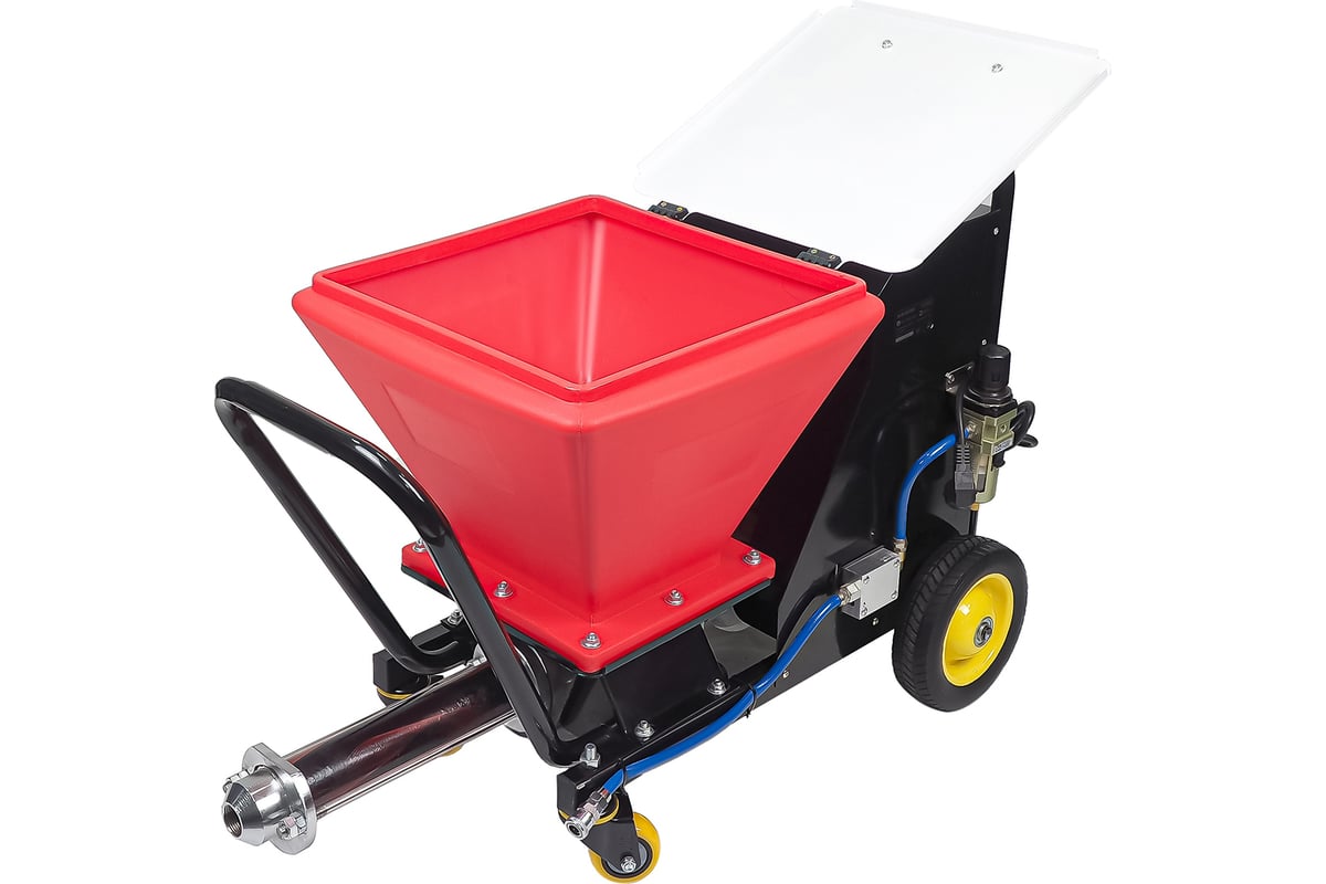 При нажатии на рукоятку пистолета аппарат запускается и материал подается из бункера шнековым насосом через растворный шланг в пистолет на сопло, на котором происходит его дисперсия с помощью сжатого воздуха, подаваемого на пистолет-распылитель по воздушному шлангу.