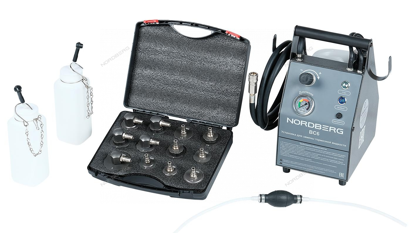 Установка электрическая для прокачки тормозной системы и системы сцепления Nordberg BC6. Емкость бака 5 л. Удаление и замена жидкости в большинстве типов и моделей тормозных систем автомобилей. Подходит для тормозных систем легковых автомобилей и легких грузовиков