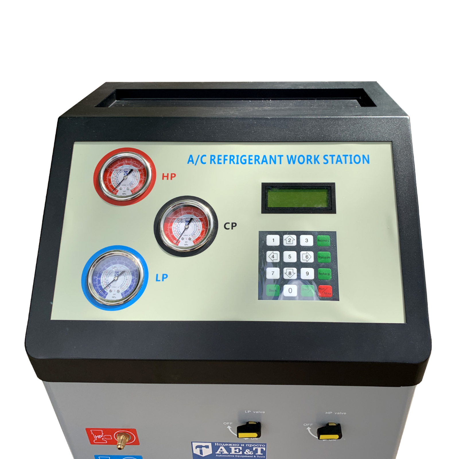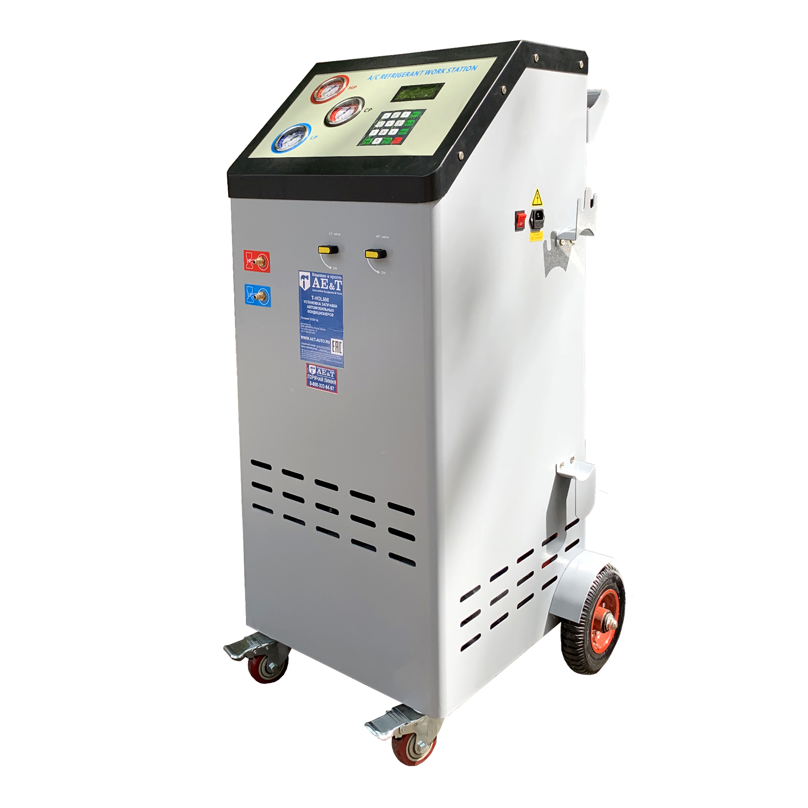 Установка подключается специальными шлангами (в комплекте) к системе кондиционирования машины. С помощью встроенного вакуумного насоса фреон откачивается во внутреннюю емкость в установке, проходя через фильтр. После этого происходит вакуумирование системы автомобиля и проверка ее герметичности. Затем этот вакуум заполняется очищенным фреоном с добавлением нового до необходимого объема.