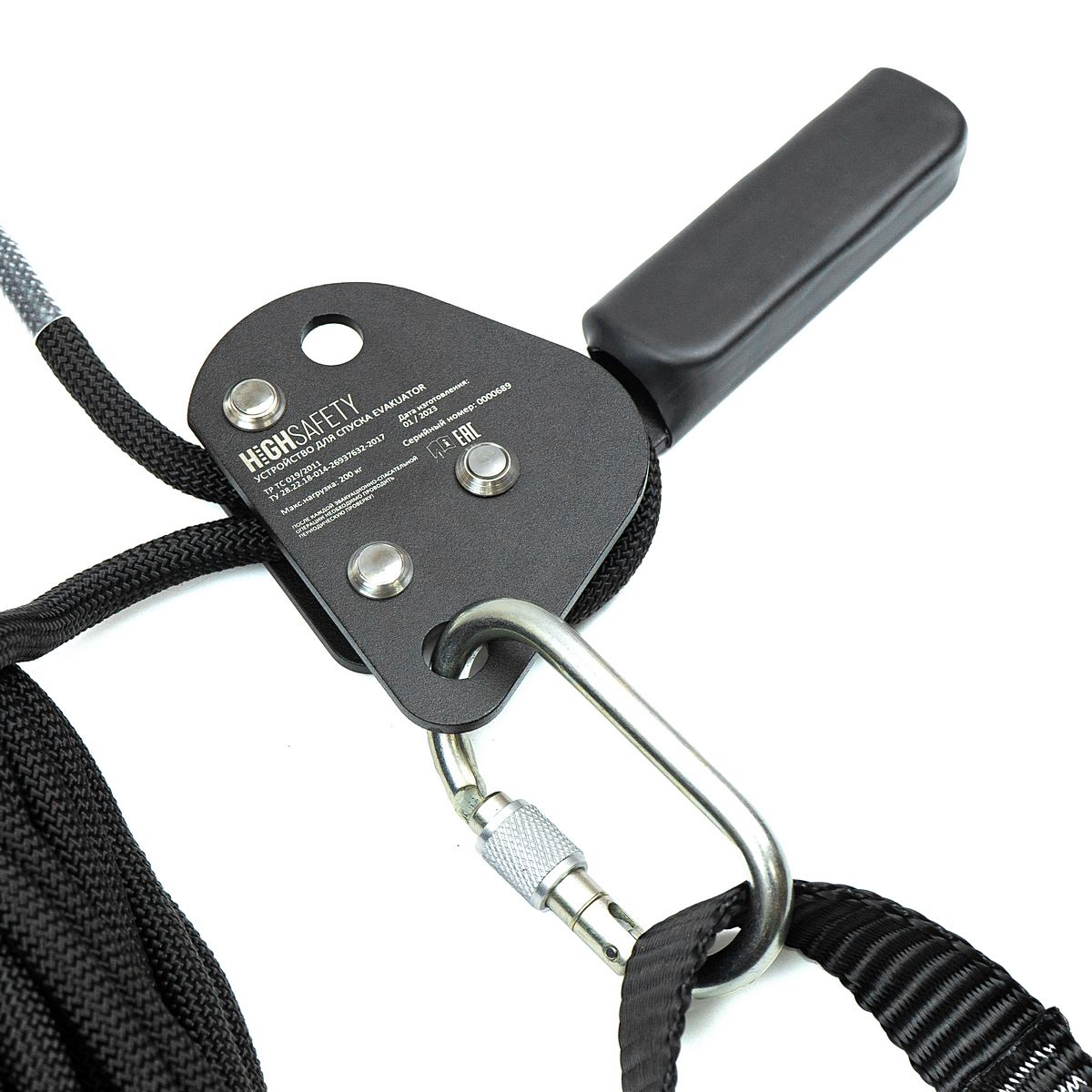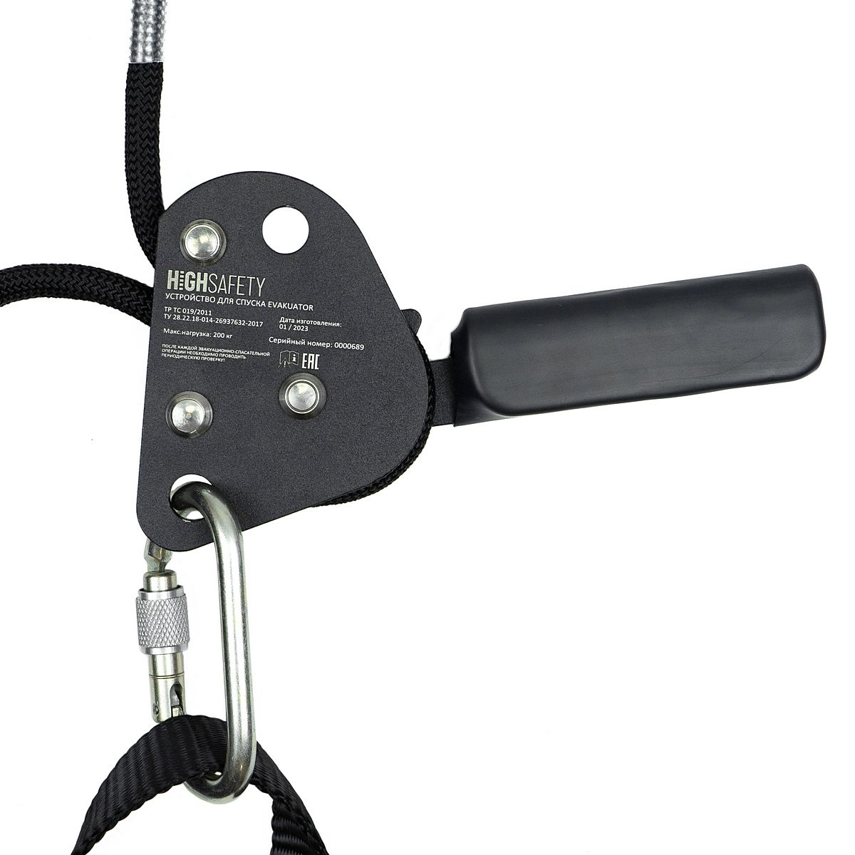 Устройство для спуска EVAKUATOR является элементом системы индивидуальной защиты от падения с высоты. Представляет собой устройство спуска класса С для спасения и защиты от падения, с помощью которого человек может спускаться на ограниченной скорости самостоятельно или с помощью другого человека с более высокого места на более низкое так, чтобы предотвратить его падение (например, работа на кранах, мачтах и других местах, где может потребоваться эвакуация).