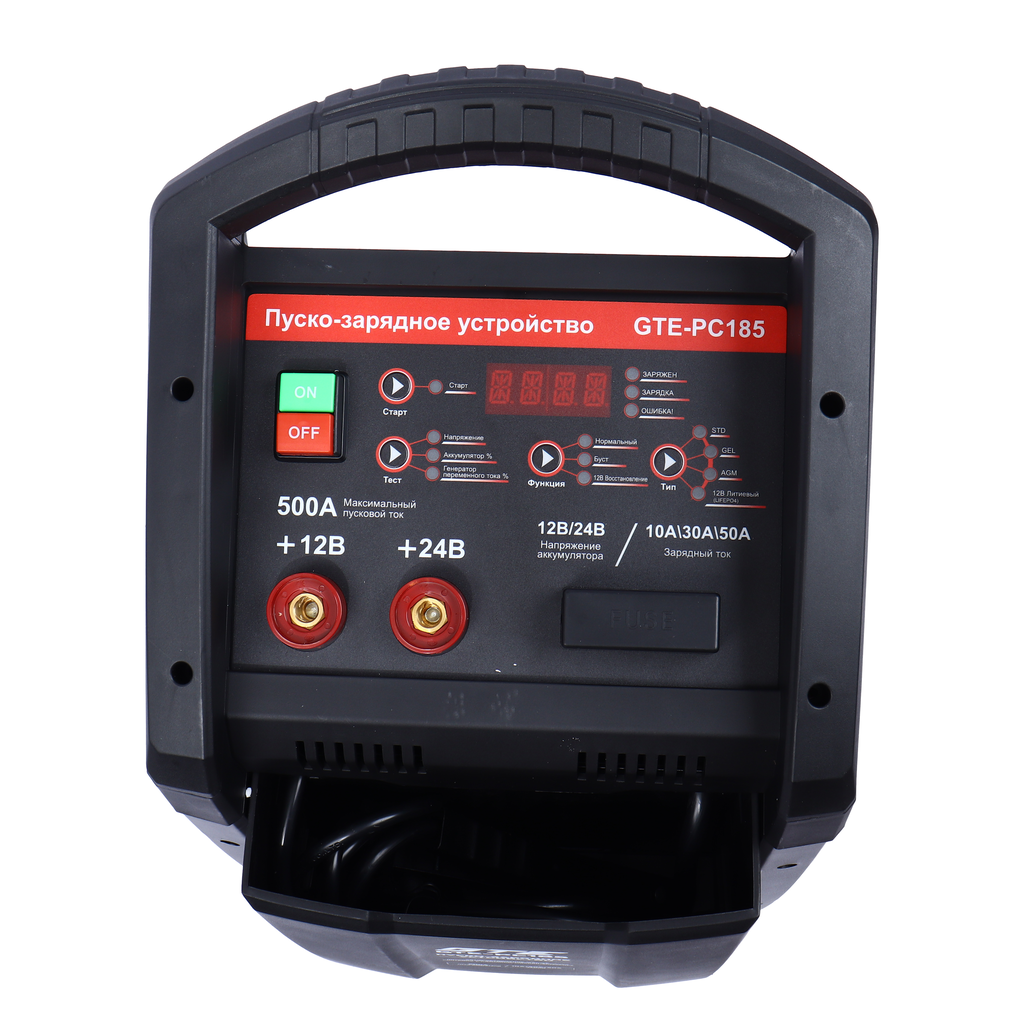 Пуско_зарядное устройство GTE_PC185 — современное многофункциональное решение для обслуживания аккумуляторных батарей. Прибор предназначен для работы со свинцово_кислотными аккумуляторами напряжением 12 В и 24 В (включая типы WET, MF, CA, EFB, GEL, AGM), а также с 12_вольтовыми литиевыми аккумуляторами.