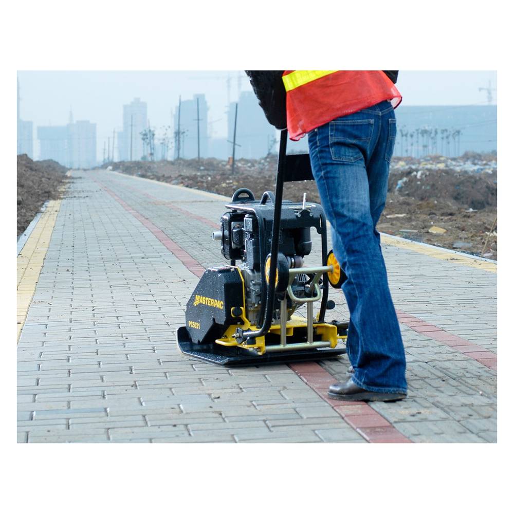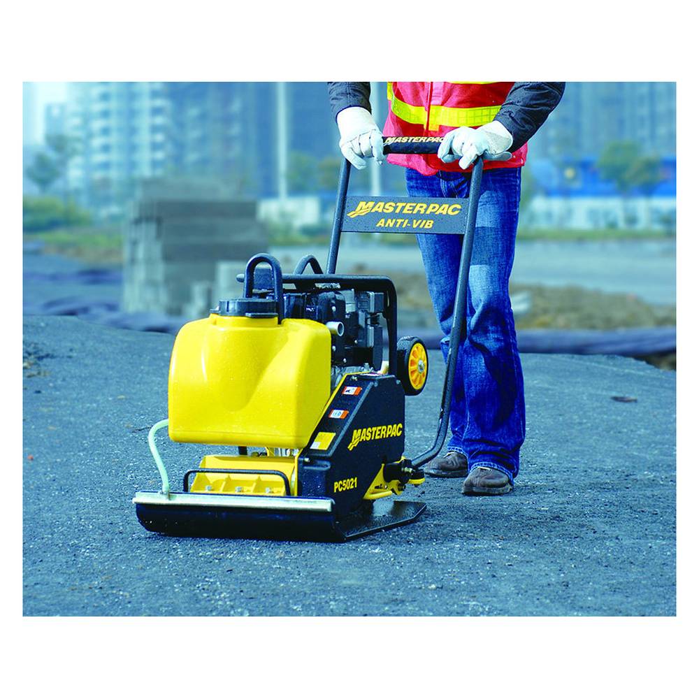 Виброплита MASTERPAC PC5021H.2 - технологичная и достаточно мощная виброплита прямоходного типа в категории свыше 100кг. Сухой вес машины 115кг. Энергоемкий редуктор настроен на частоту 90 Гц с центробежной силой 21кН. Параметры оборудования позволяют качественно уплотнять песчано-щебневые насыпи, отсев, крошку. Глубина трамбования примерно 300-400мм. Как опцию на модель можно докупить систему смачивания с водяным баком. Это позволит эффективно работать по горячему асфальту. Также как опция поставляются колеса. Данная модель комплектуется мотором Honda GX160. Этот двигатель широко распространен на виброплитах до 150кг. Мощности 5.5л.с. с запасом хватает для уверенной тяги на песчаных поверхностях. При движении по свежеуложенному асфальту скорость достигает до 22м/мин. При учете ширины стального основания 500 мм машина имеет показатель производительности до 660м2 за 1 час.
