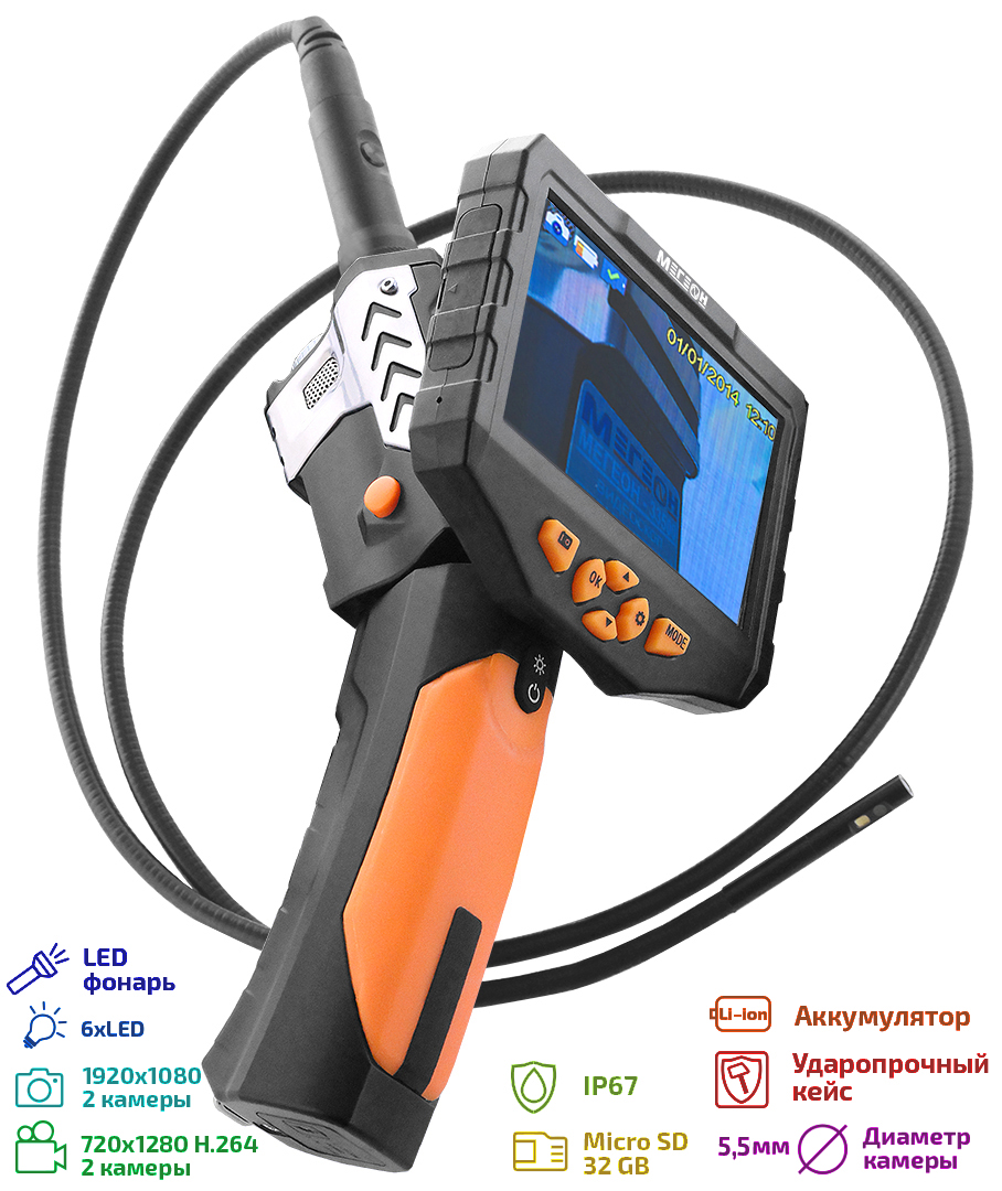 МЕГЕОН 33500- 155D - новинка в модельном ряду цифровых видеоскопов, предназначенный для решения задач в быту и промышленности. Эндоскоп представляет собой устройство для исследования и осмотра скрытых от глаза полостей с возможностью сохранения видеоизображения со звуком на встроенный носитель MicroSDHC 32Гб. Помимо этого предусмотрено получение цветных изображений с помощью фотографий. Зонд диаметром 5 мм и длиной 1 метров имеет полужёсткую конструкцию на конце которого поместились две перпендикулярно направленные камеры. Подсветки оснащены яркими светодиодами со ступенчатой регулировкой яркости, которые обеспечивают работу в условиях полного отсутствия освещения. Большой ЖК-дисплей с разрешением 1280х720 точек и диагональю 5' отчётливо отобразит всё происходящее перед объективом. Дополнительно в корпусе предусмотрена подсветка с высокой интенсивности свечения, которая с лёгкостью заменит фонарик. Преимущества изделия по достоинству смогут оценить профессионалы и любители.