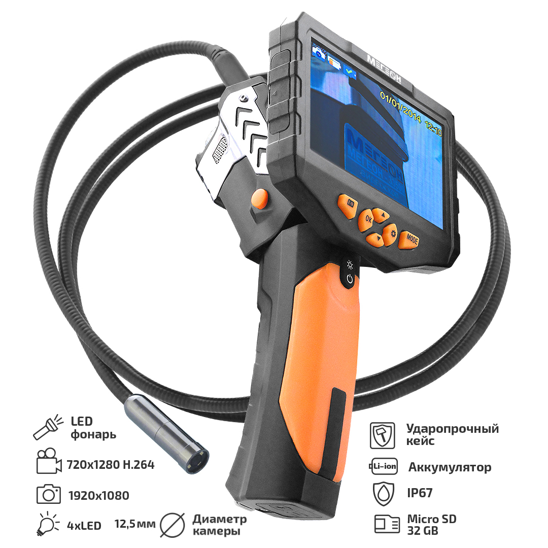 МЕГЕОН 33500-3125 - новинка в модельном ряду цифровых видеоскопов, предназначенный для решения задач в быту и промышленности. Эндоскоп представляет собой устройство для исследования и осмотра скрытых от глаза полостей с возможностью сохранения видеоизображения со звуком на встроенный носитель MicroSDHC 32Гб. Помимо этого предусмотрено получение цветных изображений с помощью фотографий. Большой ЖК-дисплей с разрешением 1280х720 и диагональю 5' отчётливо отобразит всё происходящее перед камерой. Зонд диаметром 6,9 мм и длиной 3 метра имеет полужёсткую конструкцию. Подсветка оснащена шестью яркими светодиодами со ступенчатой регулировкой яркости, которые обеспечивают работу в условиях полного отсутствия освещения. Дополнительно в корпусе предусмотрена подсветка с высокой интенсивности свечения, которая с лёгкость заменит фонарик. Преимущества изделия по достоинству смогут оценить профессионалы и любители.