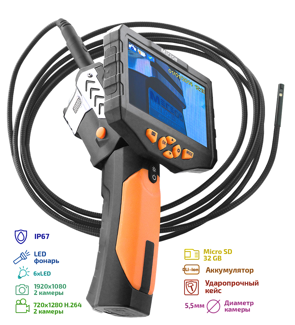 МЕГЕОН 33500- 355D - новинка в модельном ряду цифровых видеоскопов, предназначенный для решения задач в быту и промышленности. Эндоскоп представляет собой устройство для исследования и осмотра скрытых от глаза полостей с возможностью сохранения видеоизображения со звуком на встроенный носитель MicroSDHC 32Гб. Помимо этого предусмотрено получение цветных изображений с помощью фотографий. Зонд диаметром 5 мм и длиной 3 метра имеет полужёсткую конструкцию на конце которого поместились две перпендикулярно направленные камеры. Подсветки оснащены яркими светодиодами со ступенчатой регулировкой яркости, которые обеспечивают работу в условиях полного отсутствия освещения. Большой ЖК-дисплей с разрешением 1280х720 и диагональю 5' отчётливо отобразит всё происходящее перед объективом. Дополнительно в корпусе предусмотрена подсветка с высокой интенсивности свечения, которая с лёгкостью заменит фонарик. Преимущества изделия по достоинству смогут оценить профессионалы и любители.