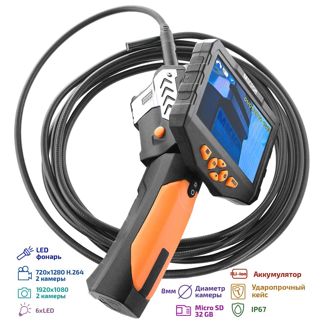 МЕГЕОН 33500- 58D - новинка в модельном ряду цифровых видеоскопов, предназначенный для решения задач в быту и промышленности. Эндоскоп представляет собой устройство для исследования и осмотра скрытых от глаза полостей с возможностью сохранения видеоизображения со звуком на встроенный носитель MicroSDHC 32Гб. Помимо этого предусмотрено получение цветных изображений с помощью фотографий. Зонд диаметром 6,9 мм и длиной 5 метров имеет полужёсткую конструкцию на конце которого поместились две перпендикулярно направленные камеры. Подсветки оснащены яркими светодиодами со ступенчатой регулировкой яркости, которые обеспечивают работу в условиях полного отсутствия освещения. Большой ЖК-дисплей с разрешением 1280х720 точек и диагональю 5' отчётливо отобразит всё происходящее перед объективом. Дополнительно в корпусе предусмотрена подсветка с высокой интенсивности свечения, которая с лёгкостью заменит фонарик. Преимущества изделия по достоинству смогут оценить профессионалы и любители.