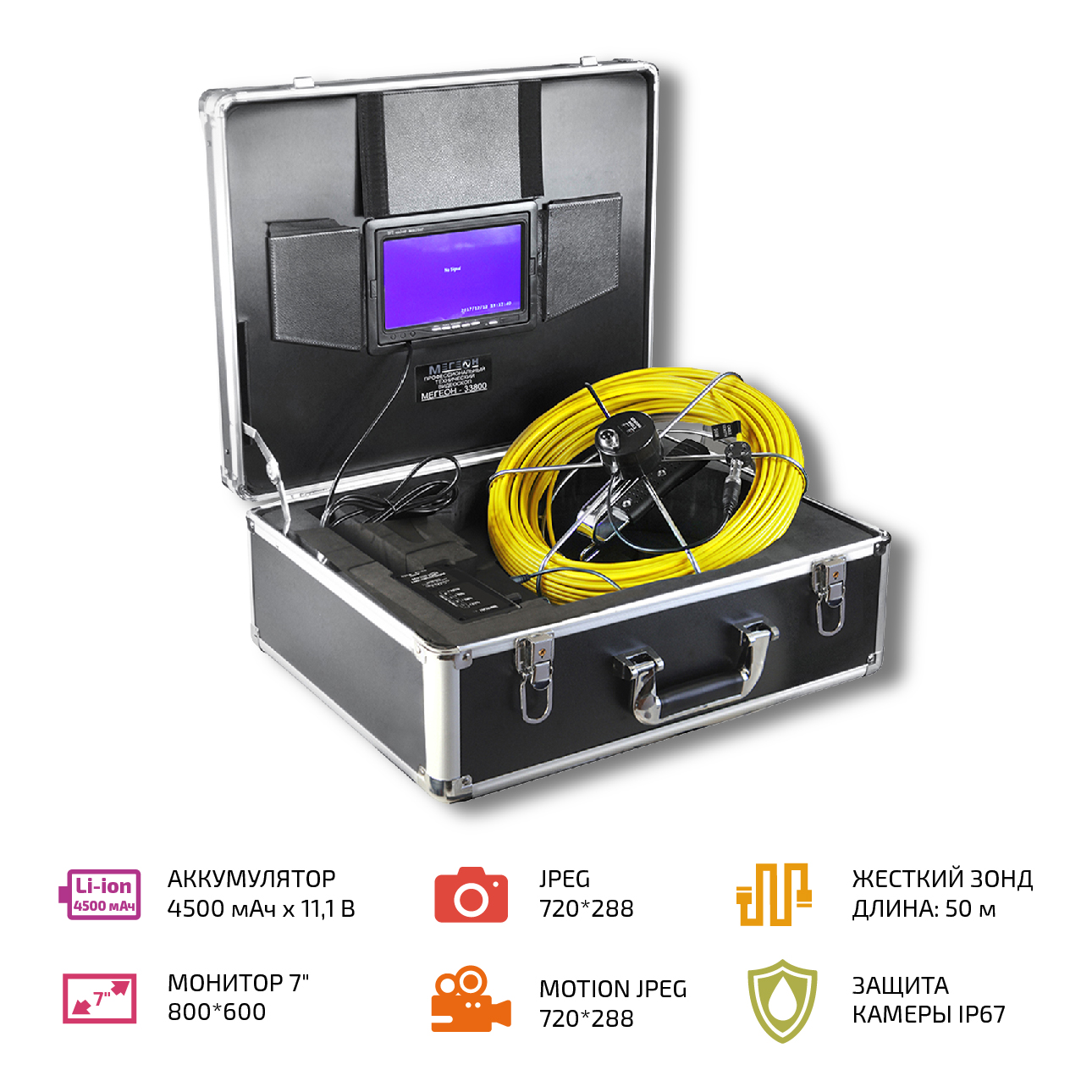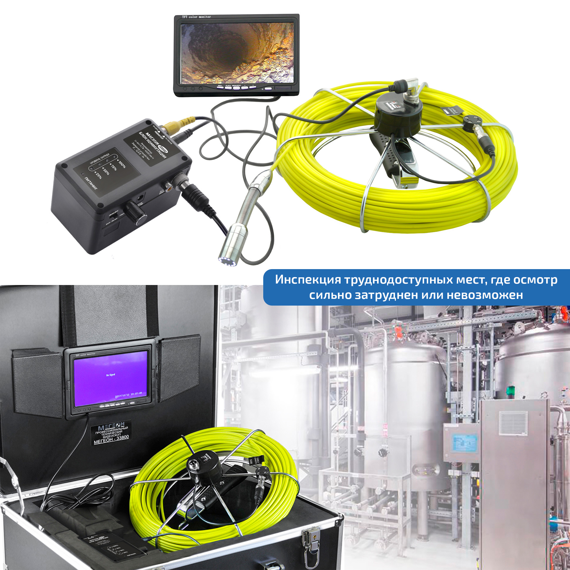 МЕГЕОН 33800 – это промышленный видеоскоп с жёстким зондом длиной 50 метров и возможностью фото и видеозаписи в реальном времени. Он оборудован аналоговой камерой диаметром 23 мм с регулируемой светодиодной подсветкой для работы в темноте. Наличие ёмкого аккумулятора позволяет использовать его автономно в течение нескольких часов. Цветной монитор диагональю 7", с антибликовыми козырьками и сохранением контента на карту памяти SDHC. Удобный кейс, в который помещается весь прибор - идеальное решение для хранения и транспортировки. Две роликовых насадки значительно облегчают продвижение через изгибы труб и защищают от повреждений. Основное его предназначение - это инспекция труднодоступных мест, таких как: трубопроводы, коллекторы, вентиляция, механизмы и др., где осмотр сильно затруднён или невозможен.