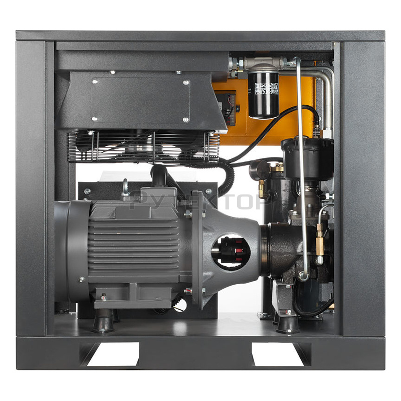 Низкий уровень шума также достигается применением шумопоглощающих панелей, установкой электродвигателя и винтового блока на виброопорах.