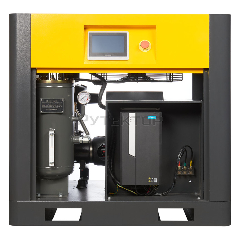 Низкий уровень шума также достигается применением шумопоглощающих панелей, установкой электродвигателя и винтового блока на виброопорах.