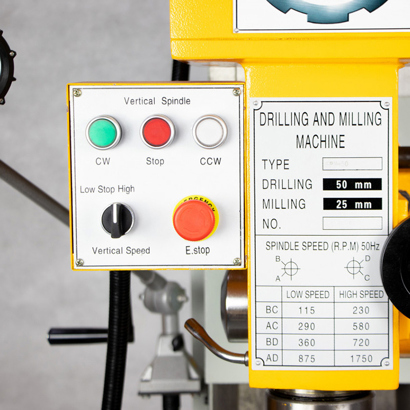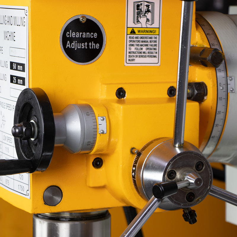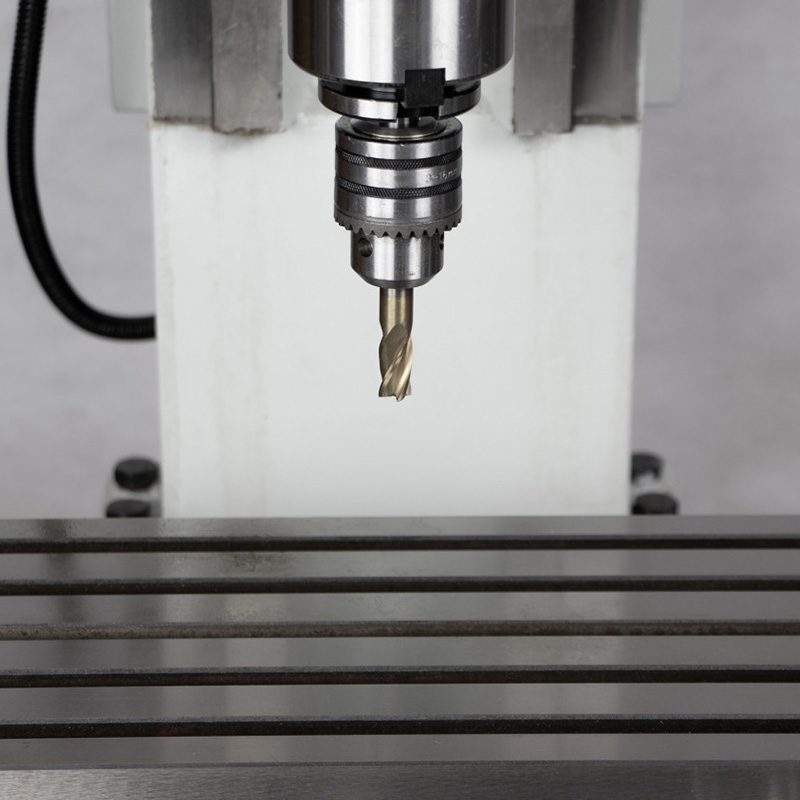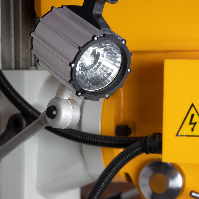 Особенности модели -это компактные размеры и простота конструкции. Станок оснащен мощным вертикальным шпинделем, способным работать на разных скоростях для выполнения различных операций. В шпиндель можно установить сверлильный или цанговый патрон и обрабатывать материалы различной твердости. Так же он может работать с торцевыми и концевыми фрезами разных размеров и способен нарезать резьбу. Фрезерную головку можно поворачивать вправо и влево на определенный угол. Расстояние от шпинделя до рабочего стола и размеры самого стола позволяют комфортно работать с различными деталями. Рабочий стол оснащен Т-образными пазами для крепления дополнительных приспособлений.