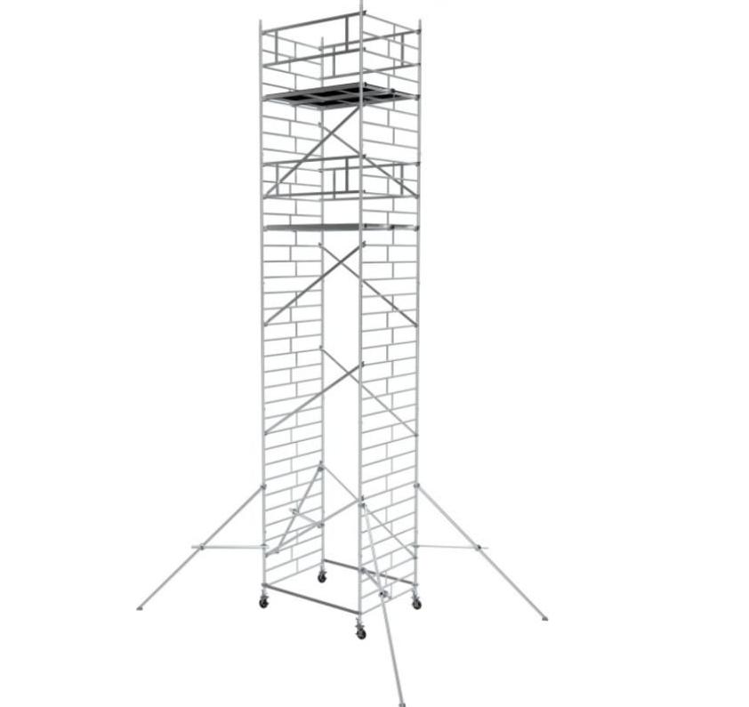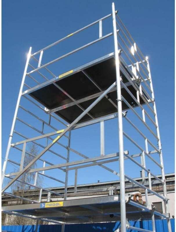 Вышка модульная алюминиевая MEGAL ВМА 1400/10 предназначена для организации рабочего места на высоте с использованием лестничных маршей в строительно-монтажных, ремонтных и прочих работах. Вышка собирается из двухметровых и метровых вертикальных рам. Рамы стыкуются между собой и фиксируются крепежными скобами. Все ступени рам выполнены из рифленого профиля, что обеспечивает безопасный подъем. Используются диагональные и горизонтальные связи (стяжки). Рабочий настил размером 2,0 х 1,4 м с люком. Вышка монтируется на компактном основании из стальных стяжек. Мобильность вышки достигается за счет поворотных колес со стопорами.