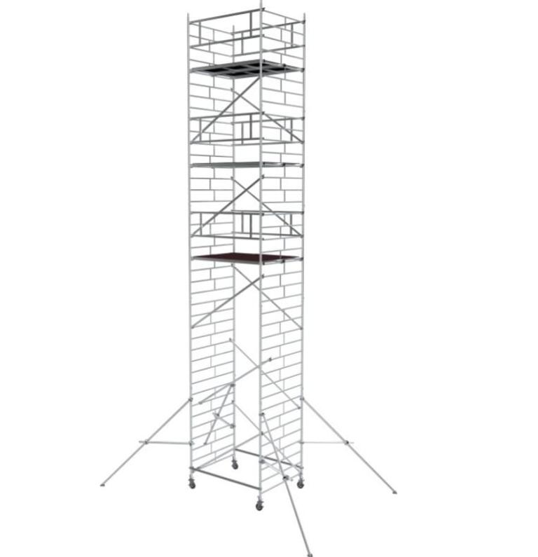 Вышка модульная алюминиевая MEGAL ВМА 1400/11 предназначена для организации рабочего места на высоте с использованием лестничных маршей в строительно-монтажных, ремонтных и прочих работах. Вышка собирается из двухметровых и метровых вертикальных рам. Рамы стыкуются между собой и фиксируются крепежными скобами. Все ступени рам выполнены из рифленого профиля, что обеспечивает безопасный подъем. Используются диагональные и горизонтальные связи (стяжки). Рабочий настил размером 2,0 х 1,4 м с люком. Вышка монтируется на компактном основании из стальных стяжек. Мобильность вышки достигается за счет поворотных колес со стопорами.