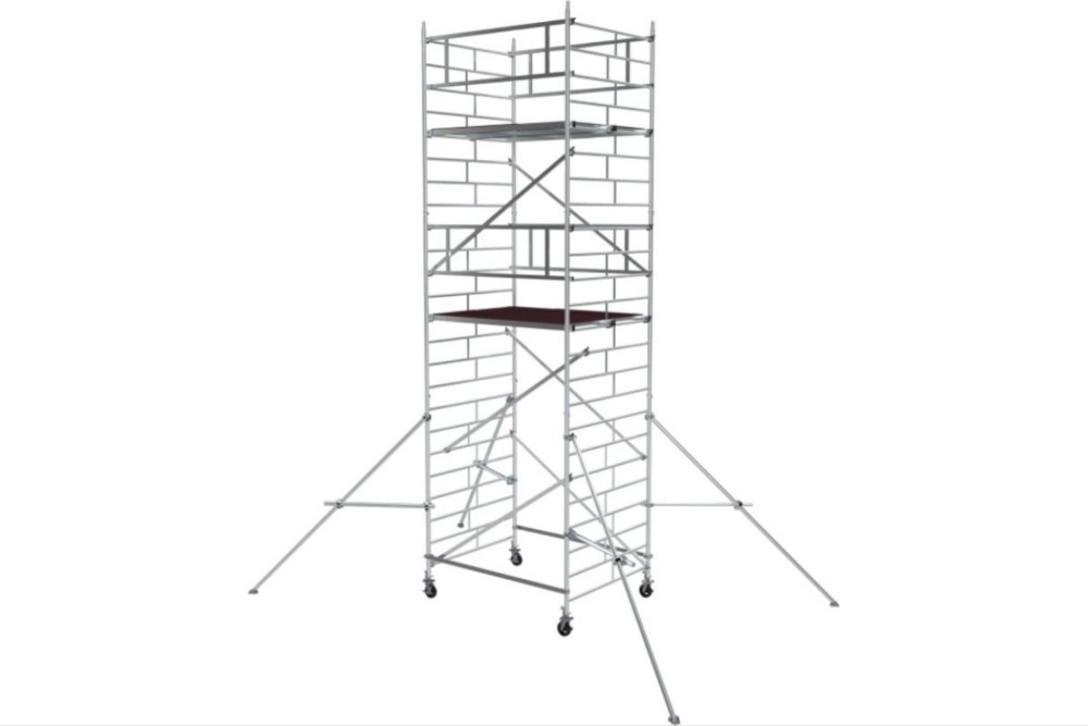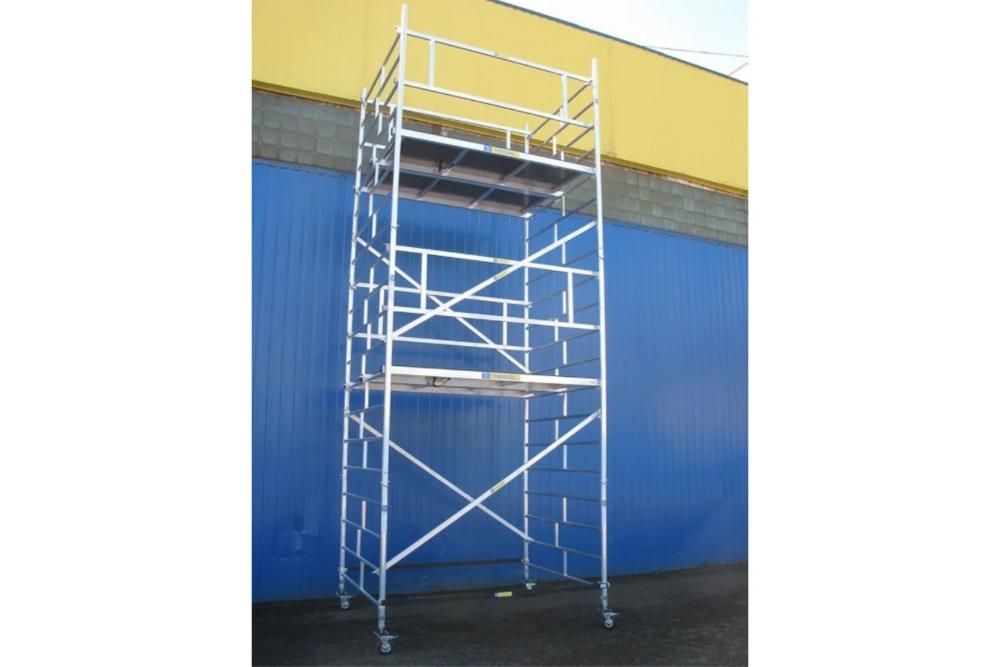 Вышка модульная алюминиевая MEGAL ВМА 1400/7 предназначена для организации рабочего места на высоте с использованием лестничных маршей в строительно-монтажных, ремонтных и прочих работах. Вышка собирается из двухметровых и метровых вертикальных рам. Рамы стыкуются между собой и фиксируются крепежными скобами. Все ступени рам выполнены из рифленого профиля, что обеспечивает безопасный подъем. Используются диагональные и горизонтальные связи (стяжки). Рабочий настил размером 2,0 х 1,4 м с люком. Вышка монтируется на компактном основании из стальных стяжек. Мобильность вышки достигается за счет поворотных колес со стопорами. Колеса регулируются по высоте в рамках длины винтовой опоры.