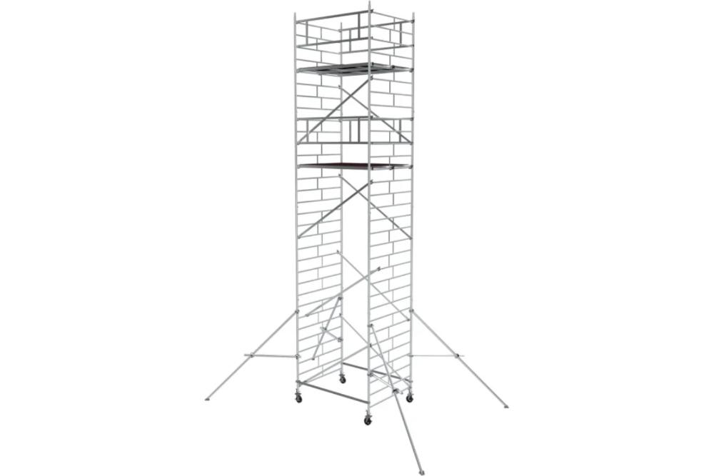 Вышка модульная алюминиевая MEGAL ВМА 1400/9 предназначена для организации рабочего места на высоте с использованием лестничных маршей в строительно-монтажных, ремонтных и прочих работах. Вышка собирается из двухметровых и метровых вертикальных рам. Рамы стыкуются между собой и фиксируются крепежными скобами. Все ступени рам выполнены из рифленого профиля, что обеспечивает безопасный подъем. Используются диагональные и горизонтальные связи (стяжки). Рабочий настил размером 2,0 х 1,4 м с люком. Вышка монтируется на компактном основании из стальных стяжек. Мобильность вышки достигается за счет поворотных колес со стопорами. Колеса регулируются по высоте в рамках длины винтовой опоры.