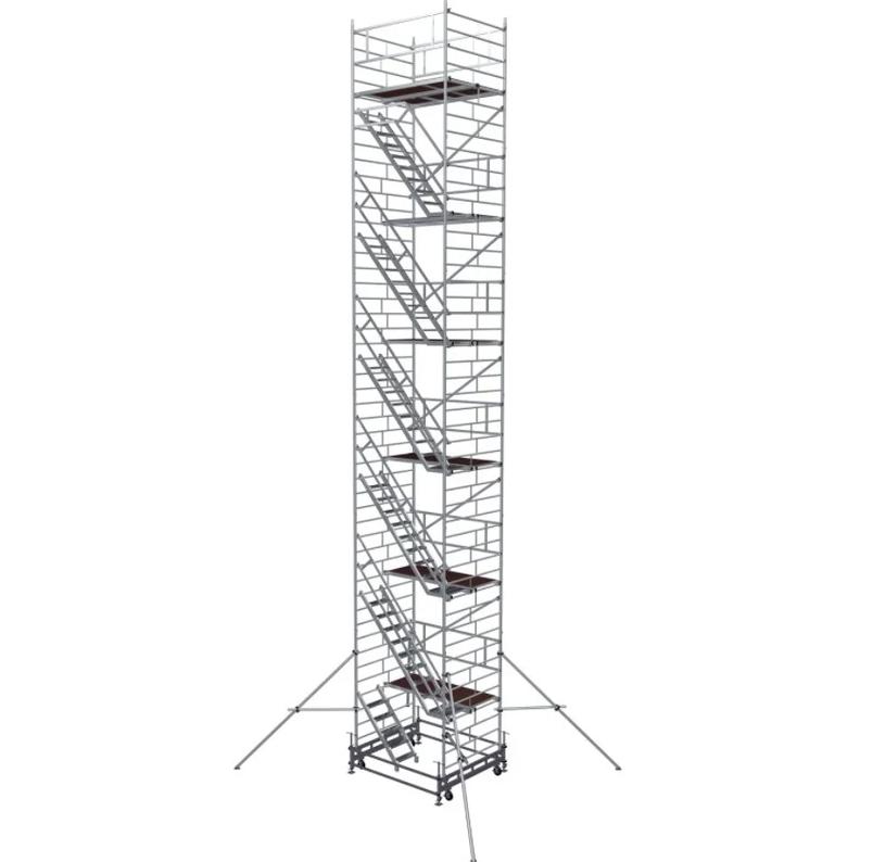 Вышка модульная алюминиевая MEGAL ВМА 1400Л/13 предназначена для организации рабочего места на высоте в строительно-монтажных, ремонтных и прочих работах. Сборка вышки производится без использования инструментов за счет наличия замкового крепления элементов. Вышка собирается из двухметровых и метровых вертикальных рам. Рамы стыкуются между собой и фиксируются крепежными скобами. Площадки соединяются наклонными лестничными маршами с рифлеными широкими ступенями, что обеспечивает комфортный подъем. Каждый марш оснащен перилами-ограждениями для безопасности. Монтируется на усиленном основании из двойной траверсы. Рабочая площадка размером 2,0 х 1,4 м позволяет с удобством расположиться четырем рабочим с инструментом. Высокая грузоподъемность обеспечивается за счет использования труб и профилей со стенкой не менее 2,5мм. Вышка имеет легкий вес за счет использования алюминиевых сплавов. Компенсация неровной поверхности возможна за счет регулирования вышки по высоте с помощью винтовых опор. Наличие поворотных колес со стопорами обеспечивает мобильность вышки.