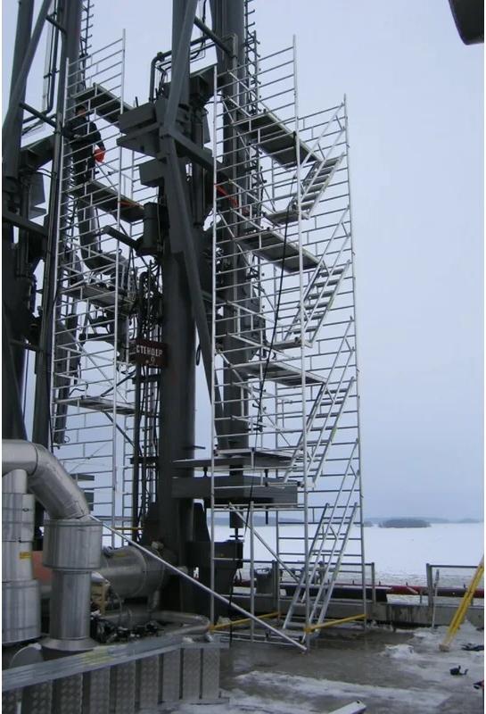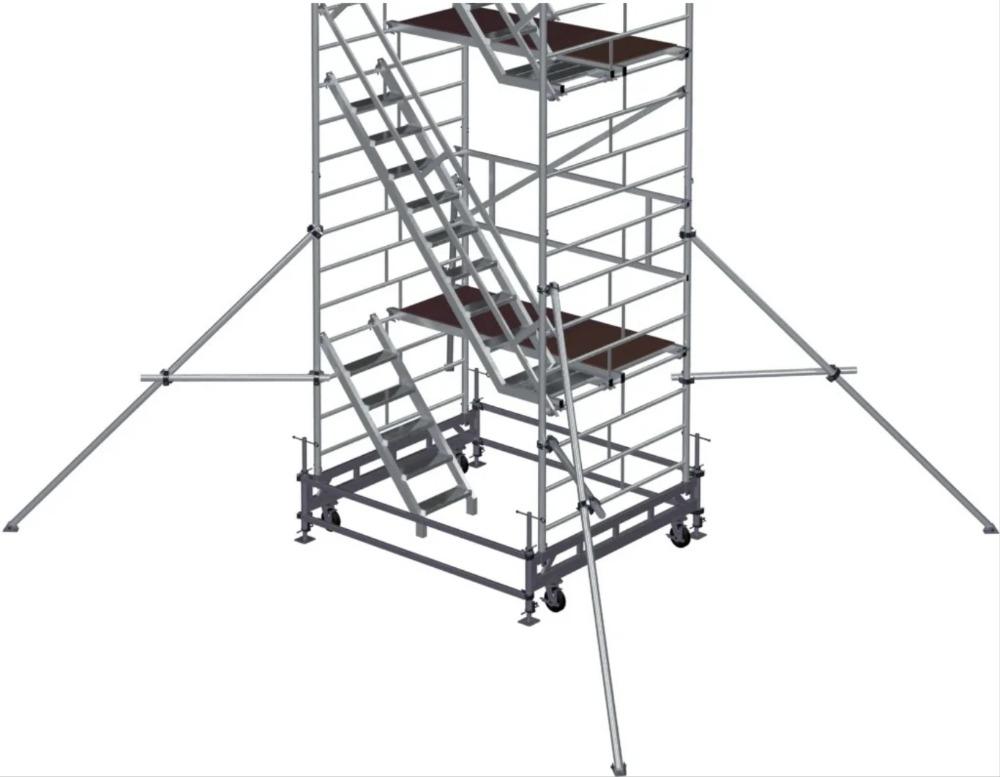Вышка модульная алюминиевая MEGAL ВМА 1400Л/18 предназначена для организации рабочего места на высоте в строительно-монтажных, ремонтных и прочих работах. Сборка вышки производится без использования инструментов за счет наличия замкового крепления элементов. Вышка собирается из двухметровых и метровых вертикальных рам. Рамы стыкуются между собой и фиксируются крепежными скобами. Площадки соединяются наклонными лестничными маршами с рифлеными широкими ступенями, что обеспечивает комфортный подъем. Каждый марш оснащен перилами-ограждениями для безопасности. Монтируется на усиленном основании из двойной траверсы. Рабочая площадка размером 2,0 х 1,4 м позволяет с удобством расположиться четырем рабочим с инструментом. Высокая грузоподъемность обеспечивается за счет использования труб и профилей со стенкой не менее 2,5мм. Вышка имеет легкий вес за счет использования алюминиевых сплавов. Компенсация неровной поверхности возможна за счет регулирования вышки по высоте с помощью винтовых опор. Наличие поворотных колес со стопорами обеспечивает мобильность вышки.