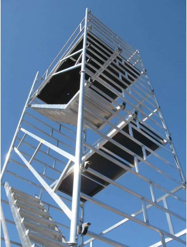 Вышка модульная алюминиевая MEGAL ВМА 1400Л/9 предназначена для организации рабочего места на высоте в строительно-монтажных, ремонтных и прочих работах. Сборка вышки производится без использования инструментов за счет наличия замкового крепления элементов. Вышка собирается из двухметровых и метровых вертикальных рам. Рамы стыкуются между собой и фиксируются крепежными скобами. Площадки соединяются наклонными лестничными маршами с рифлеными широкими ступенями, что обеспечивает комфортный подъем. Каждый марш оснащен перилами-ограждениями для безопасности. Монтируется на компактном основании из стальных стяжек. Рабочая площадка размером 2,0 х 1,4 м позволяет с удобством расположиться четырем рабочим с инструментом. Высокая грузоподъемность обеспечивается за счет использования труб и профилей со стенкой не менее 2,5мм. Вышка имеет легкий вес за счет использования алюминиевых сплавов. Компенсация неровной поверхности возможна за счет регулирования вышки по высоте с помощью винтовых опор. Наличие поворотных колес со стопорами обеспечивает мобильность вышки.