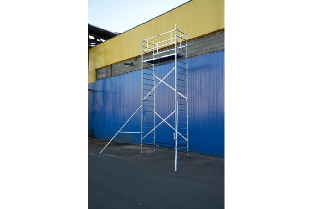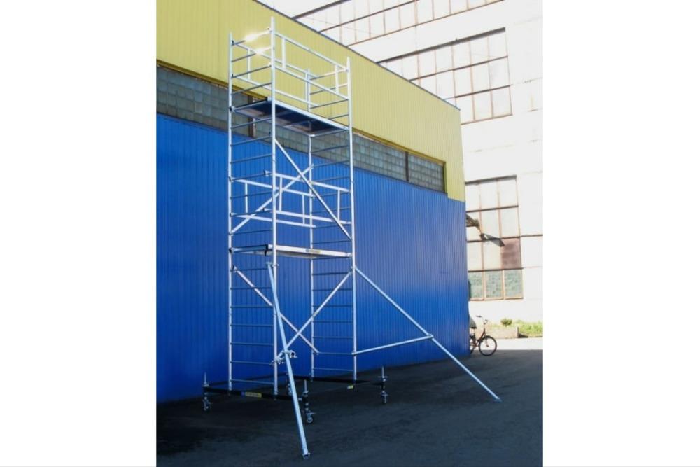 Вышка модульная алюминиевая MEGAL ВМА 700/10 предназначена для организации рабочего места на высоте с использованием лестничных маршей в строительно-монтажных, ремонтных и прочих работах. Вышка собирается из двухметровых и метровых вертикальных рам. Рамы стыкуются между собой и фиксируются крепежными скобами. Все ступени рам выполнены из рифленого профиля, что обеспечивает безопасный подъем. Используются диагональные и горизонтальные связи (стяжки). Рабочая площадка размером 2,0 х 0,7м с люком. Монтируется на усиленном основании из двойной траверсы с колесами. Мобильность вышки достигается за счет поворотных колес со стопорами. Компенсация неровной поверхности возможна за счет наличия винтовых опор, регулируемых высоте.