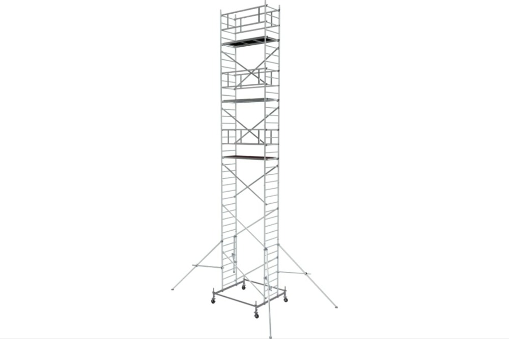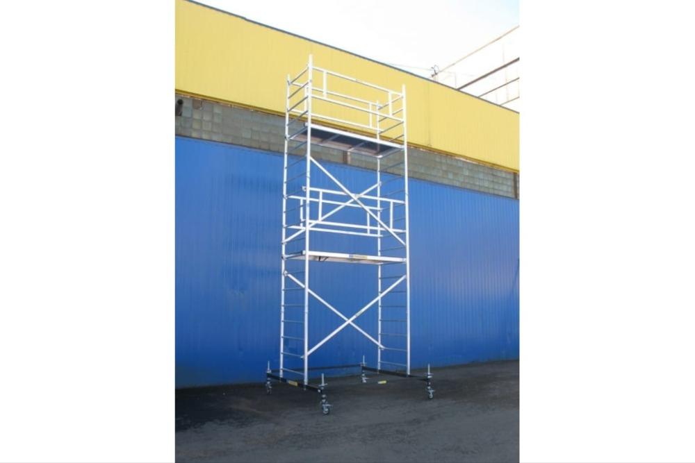 Вышка модульная алюминиевая MEGAL ВМА 700/11 предназначена для организации рабочего места на высоте с использованием лестничных маршей в строительно-монтажных, ремонтных и прочих работах. Вышка собирается из двухметровых и метровых вертикальных рам. Рамы стыкуются между собой и фиксируются крепежными скобами. Все ступени рам выполнены из рифленого профиля, что обеспечивает безопасный подъем. Используются диагональные и горизонтальные связи (стяжки). Рабочая площадка размером 2,0 х 0,7м с люком. Монтируется на усиленном основании из двойной траверсы с колесами. Мобильность вышки достигается за счет поворотных колес со стопорами. Компенсация неровной поверхности возможна за счет наличия винтовых опор, регулируемых высоте.
