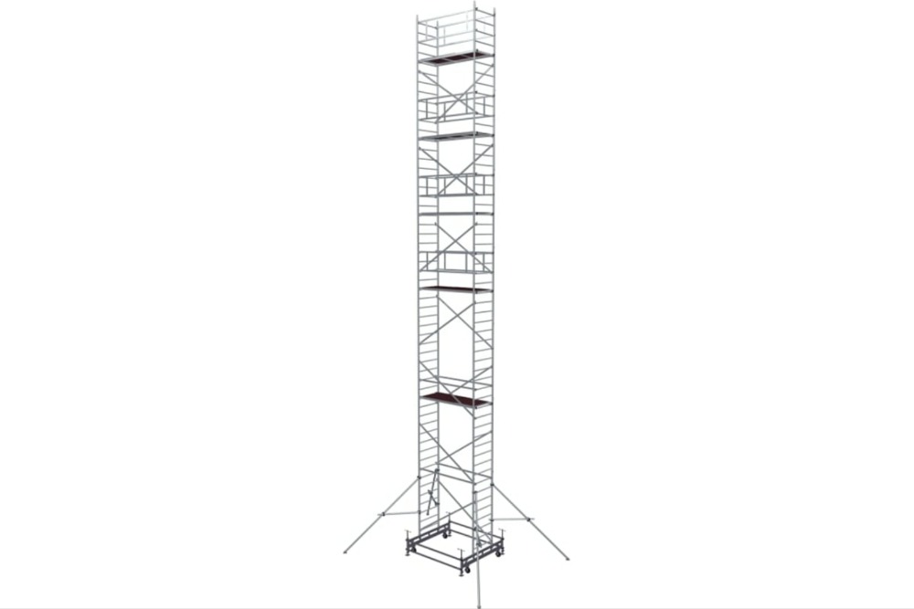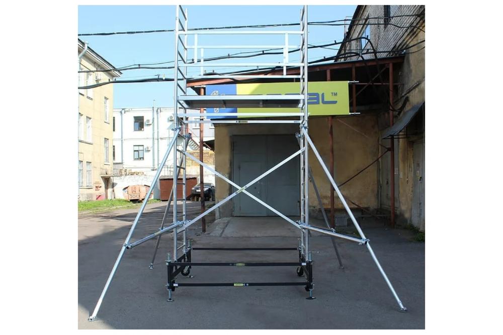 Вышка модульная алюминиевая MEGAL ВМА 700/15 предназначена для организации рабочего места на высоте с использованием лестничных маршей в строительно-монтажных, ремонтных и прочих работах. Вышка собирается из двухметровых и метровых вертикальных рам. Рамы стыкуются между собой и фиксируются крепежными скобами. Все ступени рам выполнены из рифленого профиля, что обеспечивает безопасный подъем. Используются диагональные и горизонтальные связи (стяжки). Рабочая площадка размером 2,0 х 0,7м с люком. Монтируется на усиленном основании из двойной траверсы с колесами. Мобильность вышки достигается за счет поворотных колес со стопорами. Компенсация неровной поверхности возможна за счет наличия винтовых опор, регулируемых высоте.