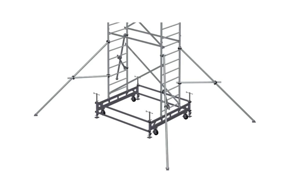 Вышка модульная алюминиевая MEGAL ВМА 700/21 предназначена для организации рабочего места на высоте с использованием лестничных маршей в строительно-монтажных, ремонтных и прочих работах. Вышка собирается из двухметровых и метровых вертикальных рам. Рамы стыкуются между собой и фиксируются крепежными скобами. Все ступени рам выполнены из рифленого профиля, что обеспечивает безопасный подъем. Используются диагональные и горизонтальные связи (стяжки). Рабочая площадка размером 2,0 х 0,7м с люком. Монтируется на усиленном основании из двойной траверсы с колесами. Мобильность вышки достигается за счет поворотных колес со стопорами. Компенсация неровной поверхности возможна за счет наличия винтовых опор, регулируемых высоте.