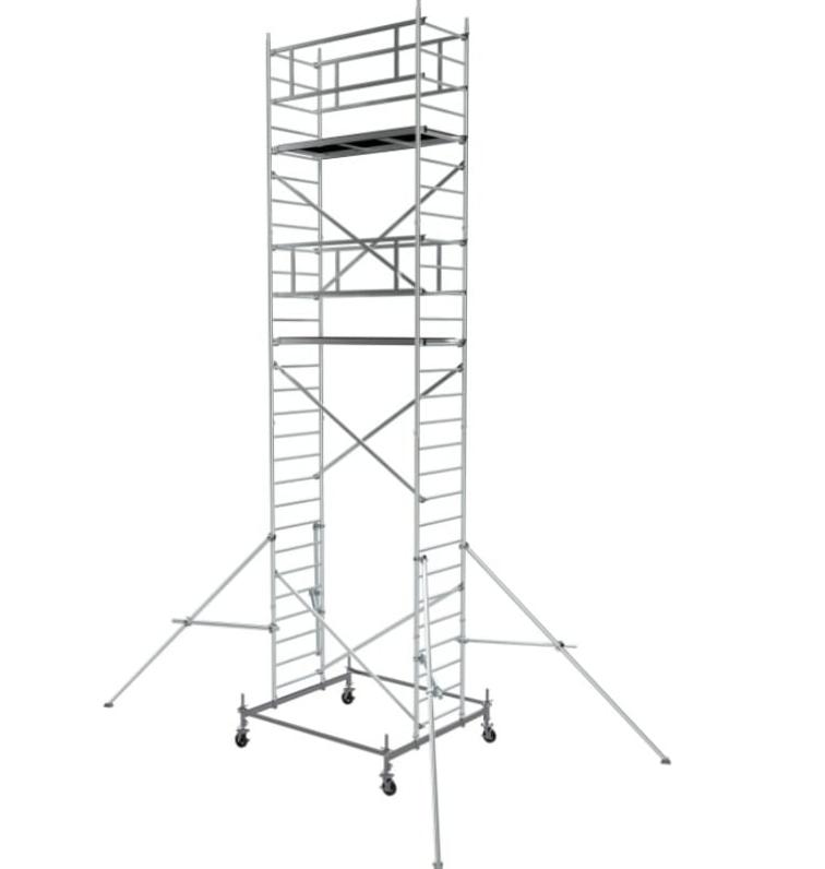 Вышка модульная алюминиевая MEGAL ВМА 700/8 используется для организации рабочего места на высоте в строительно-монтажных, ремонтных и прочих работах. Вышка собирается из двухметровых и метровых вертикальных рам. Рамы стыкуются между собой и фиксируются крепежными скобами. Все ступени рам выполнены из рифленого профиля. Для придания жесткости конструкции используются диагональные и горизонтальные связи (стяжки). Рабочая площадка размером 2,0 х 0,7м с люком. Вышка оснащена поворотными колесами со стопорами. Колеса регулируются по высоте в рамках длины винтовой опоры. Высокая грузоподъемность обеспечивается за счет использования труб и профилей со стенкой не менее 2,5мм.