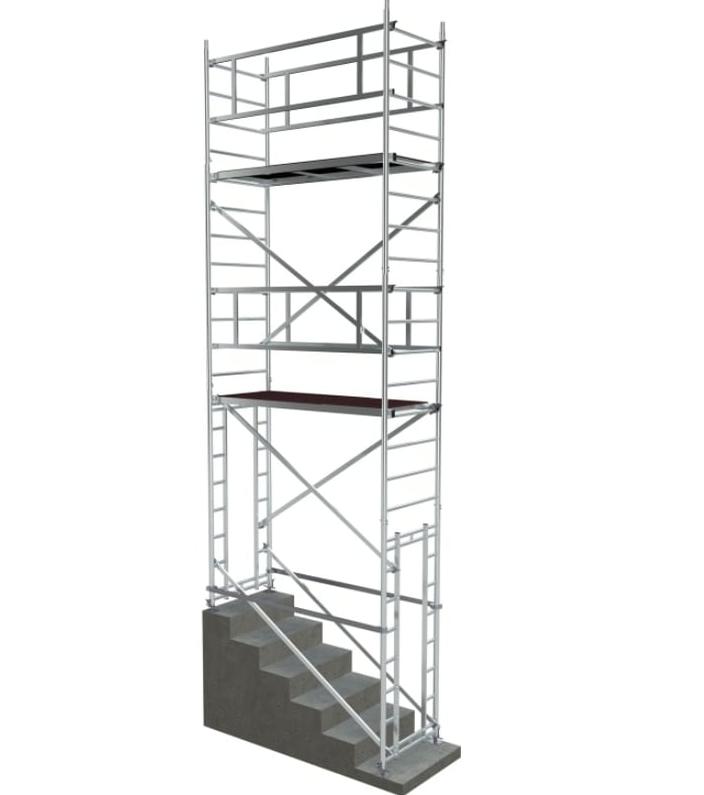 Вышка собирается из двухметровых и метровых вертикальных рам. Проходные рамы создают возможность сквозного прохода без прерывания ремонтных работ. Рамы стыкуются между собой и фиксируются крепежными скобами. Все ступени рам выполнены из рифленого профиля. Используются диагональные и горизонтальные связи (стяжки). Монтируется на узком основании. Поворотные колеса со стопорами доступны в качестве дополнительной комплектации. Вышка регулируется по высоте в рамках длины винтовой опоры
