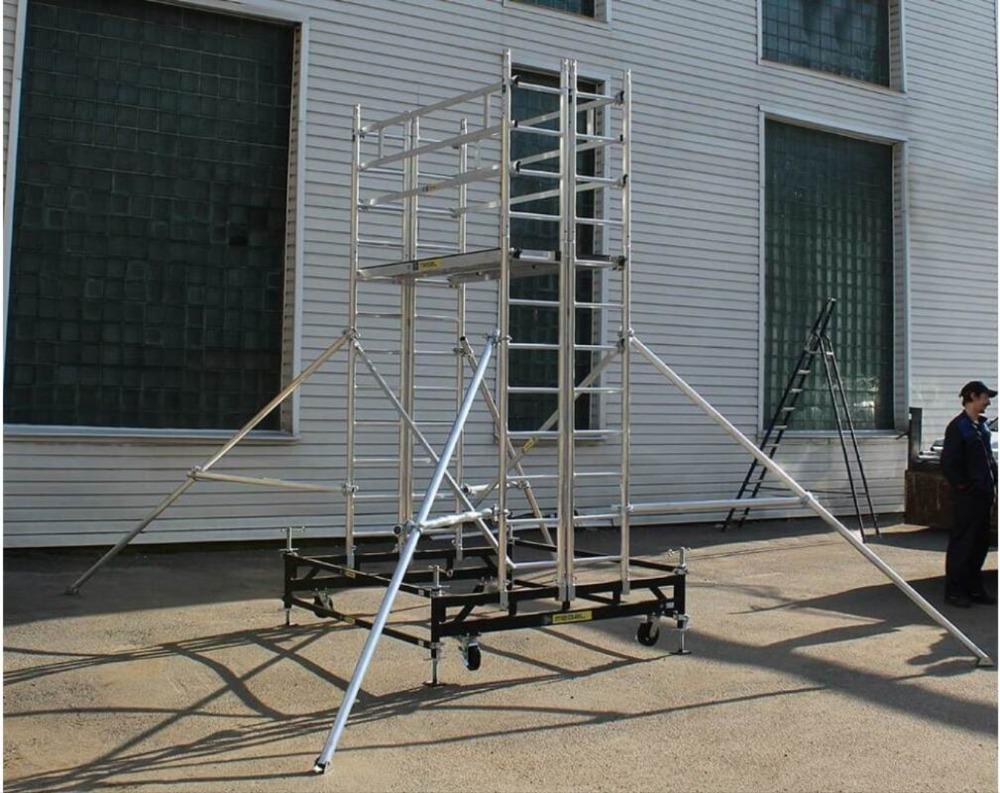 Вышка модульная алюминиевая MEGAL ВМА 900/10 используется при выполнении работ внутри резервуаров и емкостей. Габариты всех деталей не превышают 450мм, что позволяет пропустить их через технический лаз и провести сборку внутри резервуара. Вышка собирается из узких двухметровых и метровых вертикальных рам. Рамы фиксируются крепежными скобами и крепежом для стыкования рам. Безопасный подъем обеспечивается за счет использования нескользящих рифленых перекладин в рамах. Используются диагональные и горизонтальные связи (стяжки). Сборка производится без инструментов за счет наличия замкового крепления элементов. Верхний рабочий настил размером 2,0 х 0,9м с люком (составной). Промежуточные настилы размером 2,0 х 0,45м. Монтируется на усиленном основании из двойной траверсы с поворотными колесами, со стопорами. Используется надежная фиксация к стенкам резервуара за счет магнитных крепежей, которые не портят поверхность. Вышка имеет легкий вес за счет использования алюминиевых сплавов. Высокая грузоподъемность обеспечивается за счет использования труб и профилей со стенкой не менее 2,5мм. Компенсация неровной поверхности возможна за счет регулирования вышки по высоте с помощью винтовых домкратов.