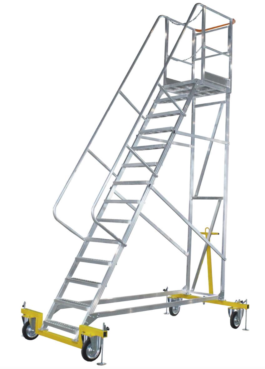 Вышка-стремянка алюминиевая MEGAL ВСА-3,5А предназначена для безопасной и удобной работы на складах, стройплощадках, в производственных цехах. За счет использования труб и профилей со стенкой не менее 2,5мм обеспечивается высокая грузоподъемность. Подъем осуществляется по широким ступеням из просечно-вытяжного листа, обеспечивающим надежное сцепление в холодное время года. Глубина ступеней 135 мм. Для безопасного подъема и спуска в конструкции предусмотрены перила по всей длине лестничного марша. Поворотные колеса обеспечивают высокую маневренность. Колесная база оснащена винтовыми опорами, обеспечивающими устойчивость изделия при работе на высоте.