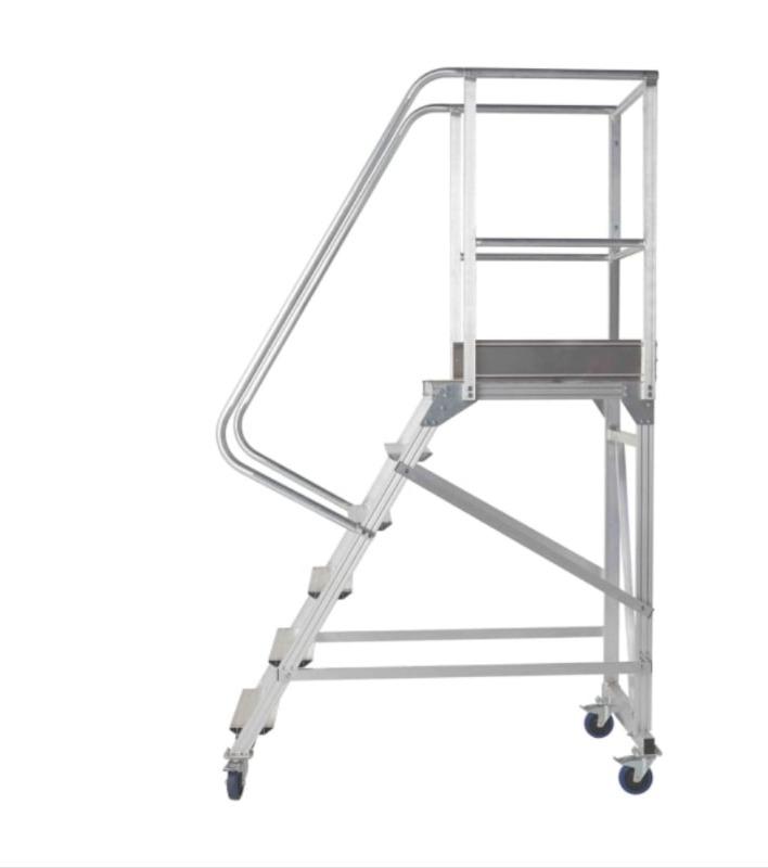 Трехстороннее ограждение площадки со встроенной защитной планкой в районе колен, бортовое ограждение, перила по всей длине лестничного марша, ступени глубиной 160мм обеспечивают безопасный подъем, спуск и проведение работ. Площадка размером 800х680мм позволяет удобно расположиться рабочему с необходимым инструментом. Небольшая занимаемая площадь и прочные поворотные колеса со стопорами позволяют легко маневрировать в ограниченном пространстве. Легкий монтаж без специального инструмента сокращают время подготовки оборудования к работе.